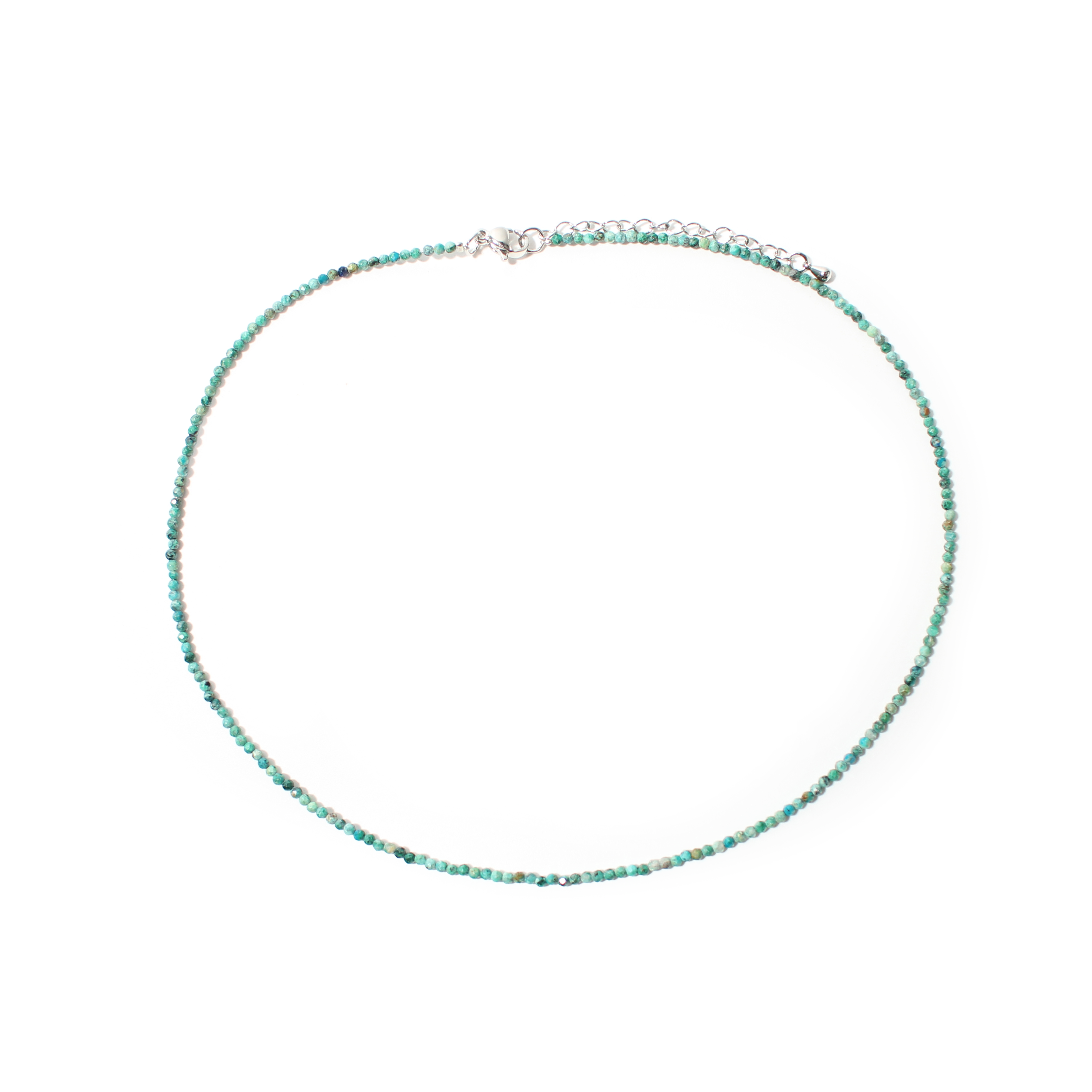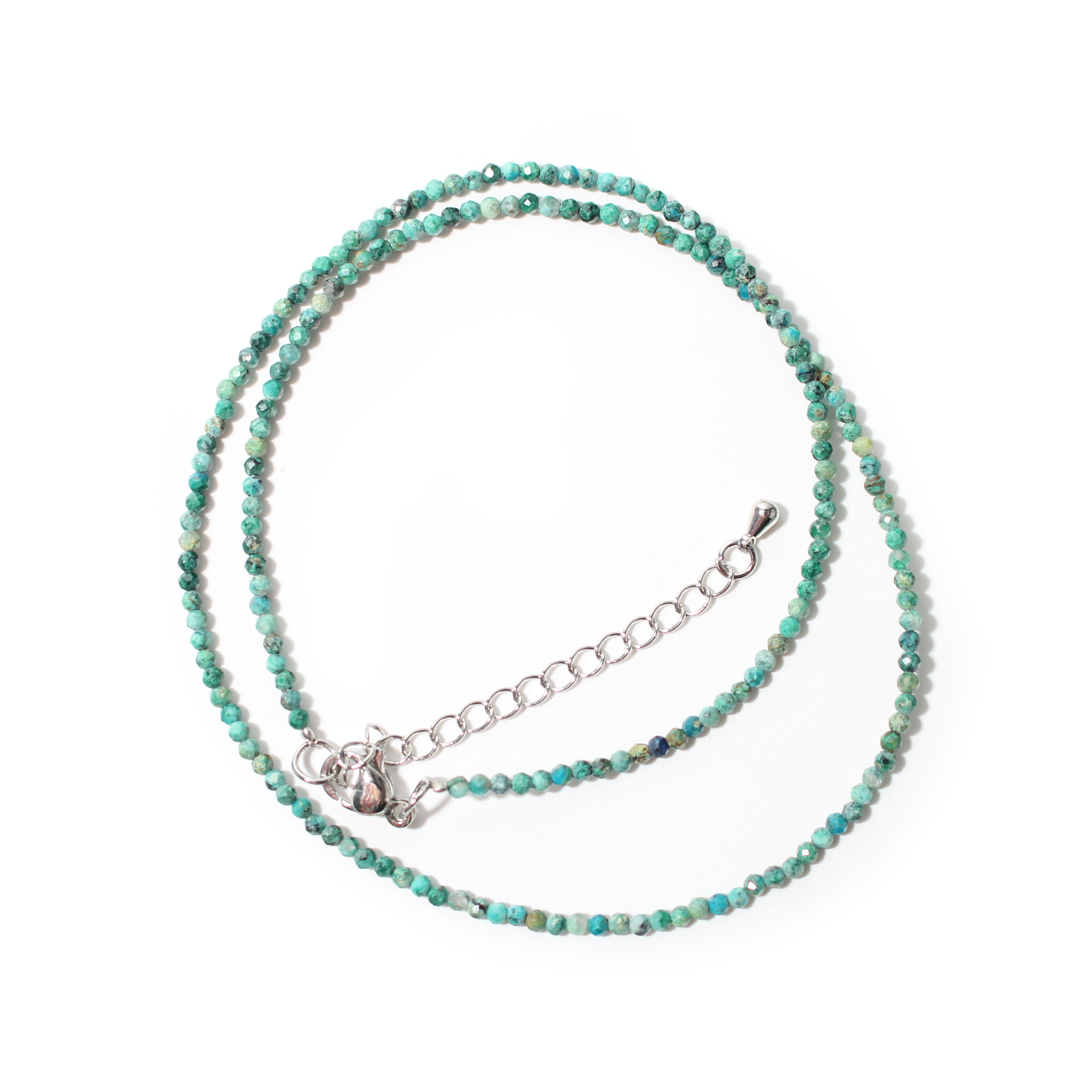 This Chrysocolla Bead Necklace features dainty 2–3mm beads in soothing teal and green tones, offering a calming and earthy elegance for everyday wear or layering.