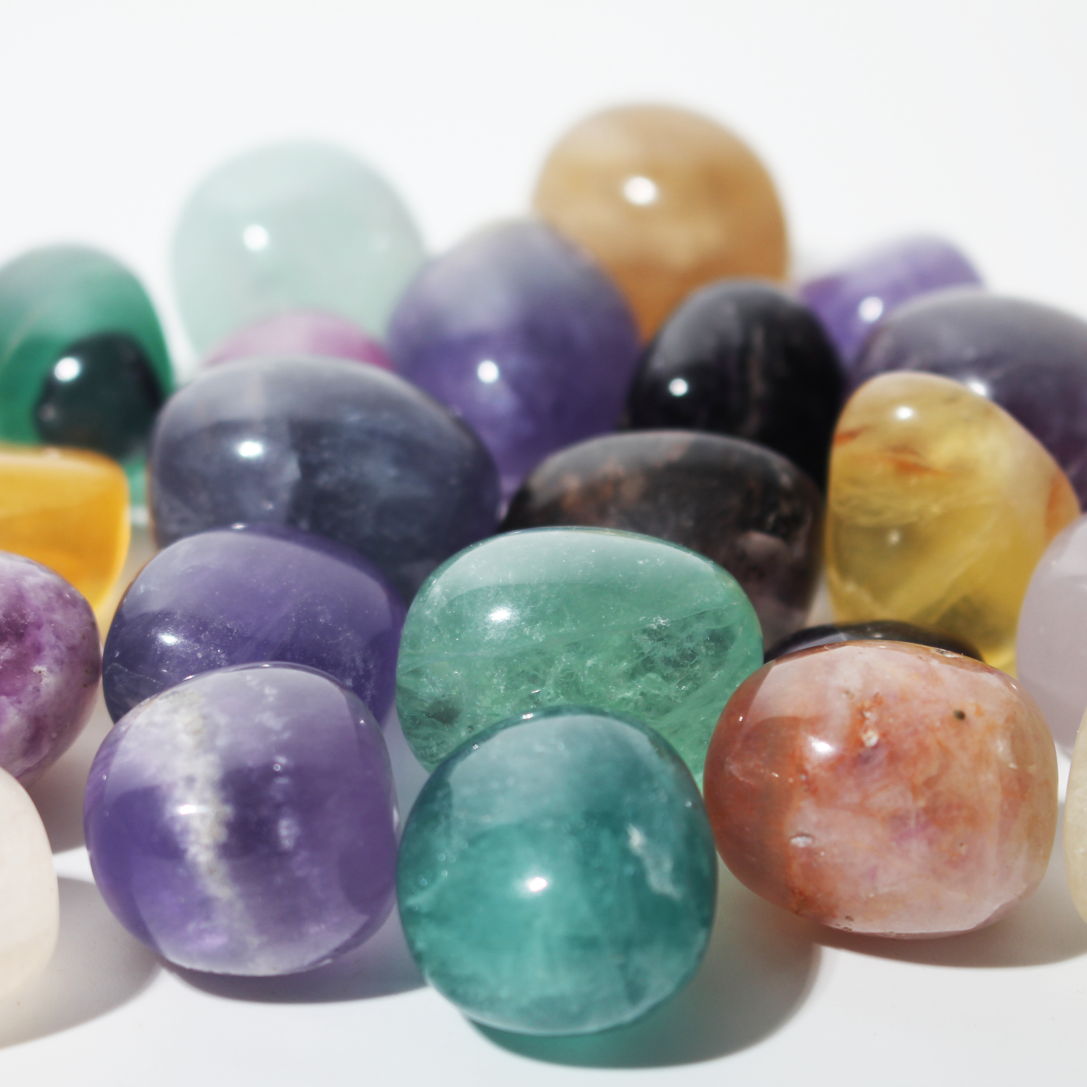 These Candy Fluorite Tumbled Stones feature bright bands of purple, green, and blue hues, polished to a glossy finish that highlights their playful, vibrant color patterns.