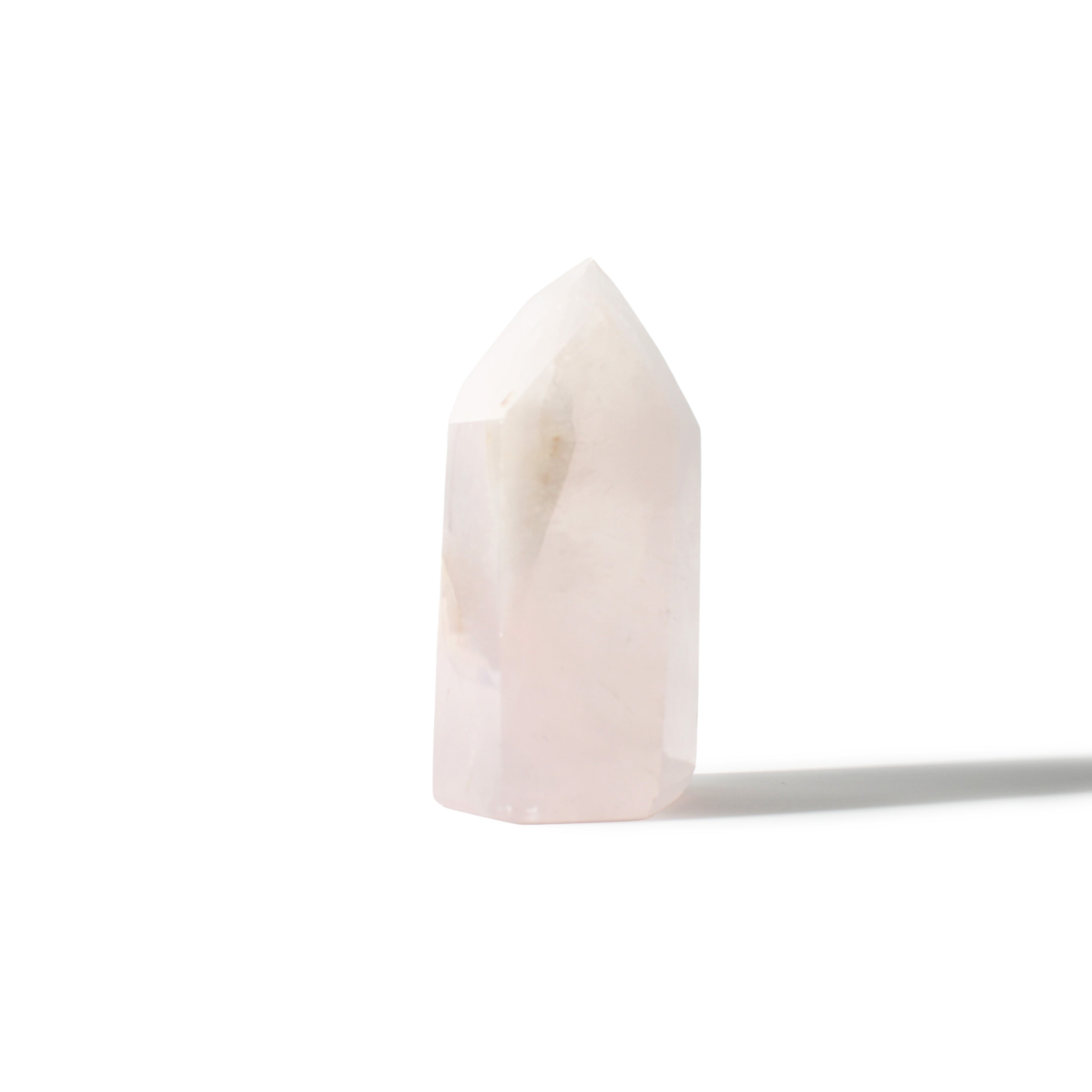 This Rose Quartz Generator stands 5 1/4" tall, showcasing soft blush-pink tones with gentle translucency, polished into a smooth, elegant point that radiates calming, heart-centered energy. Each piece highlights Rose Quartz's natural beauty and soothing presence.