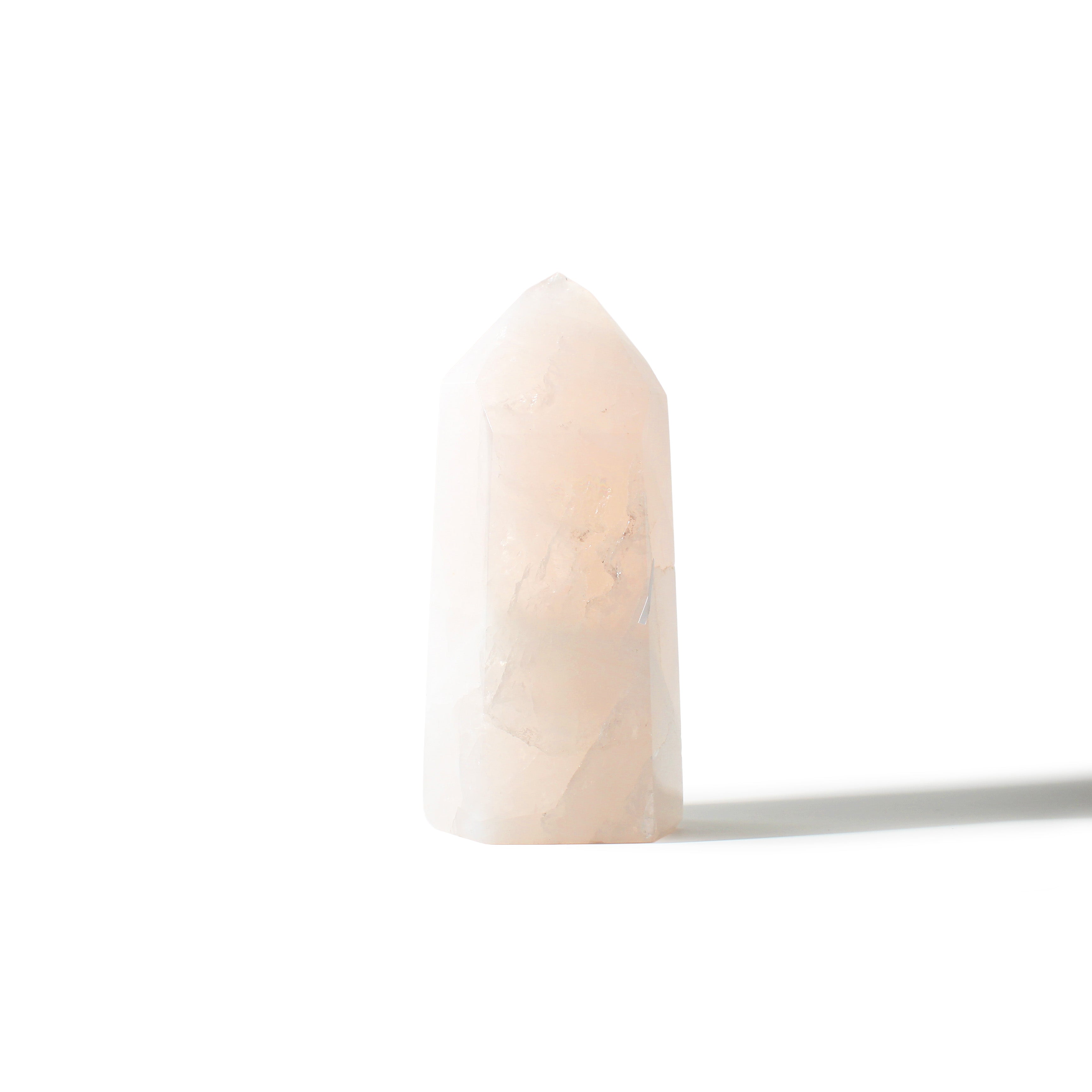 This Rose Quartz Generator stands 6 1/2" tall, showcasing soft blush-pink tones with gentle translucency, polished into a smooth, elegant point that radiates calming, heart-centered energy. Each piece highlights Rose Quartz's natural beauty and soothing presence.