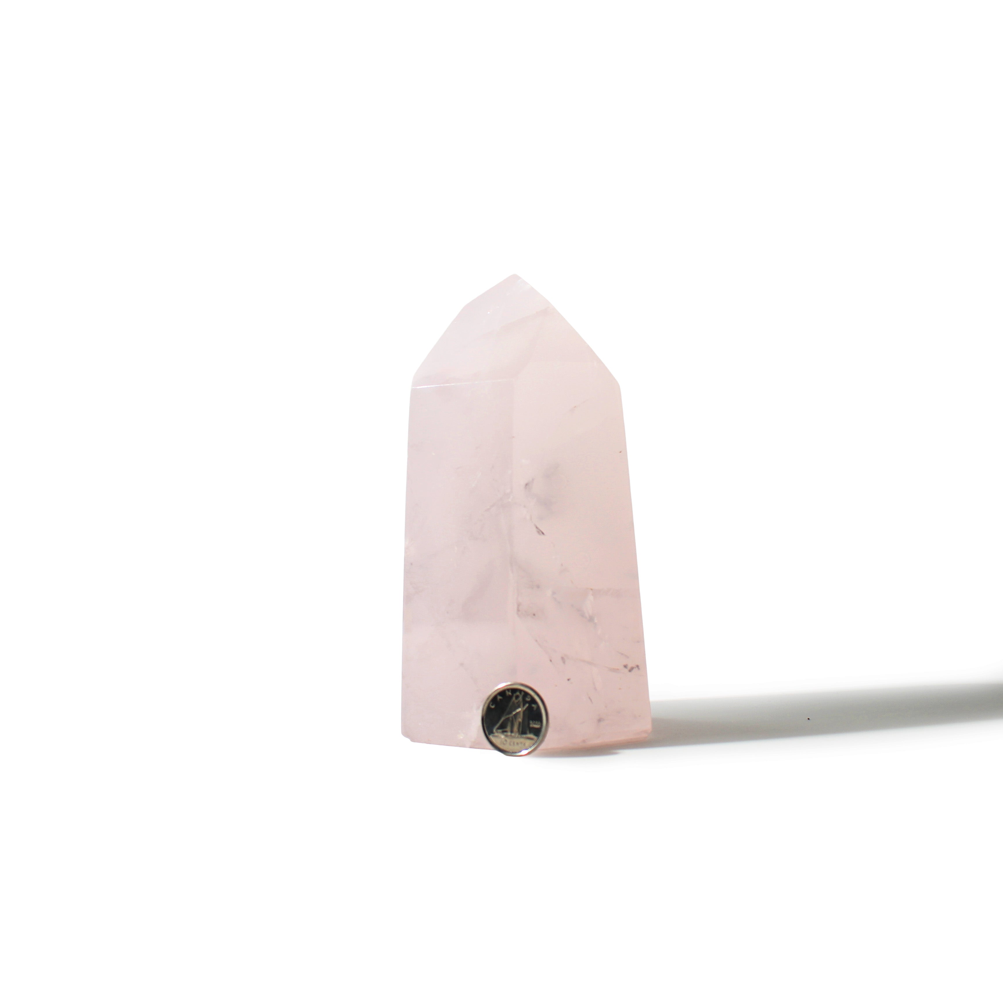 This Rose Quartz Generator stands 6 1/4" tall, showcasing soft blush-pink tones with gentle translucency, polished into a smooth, elegant point that radiates calming, heart-centered energy. Each piece highlights Rose Quartz's natural beauty and soothing presence.