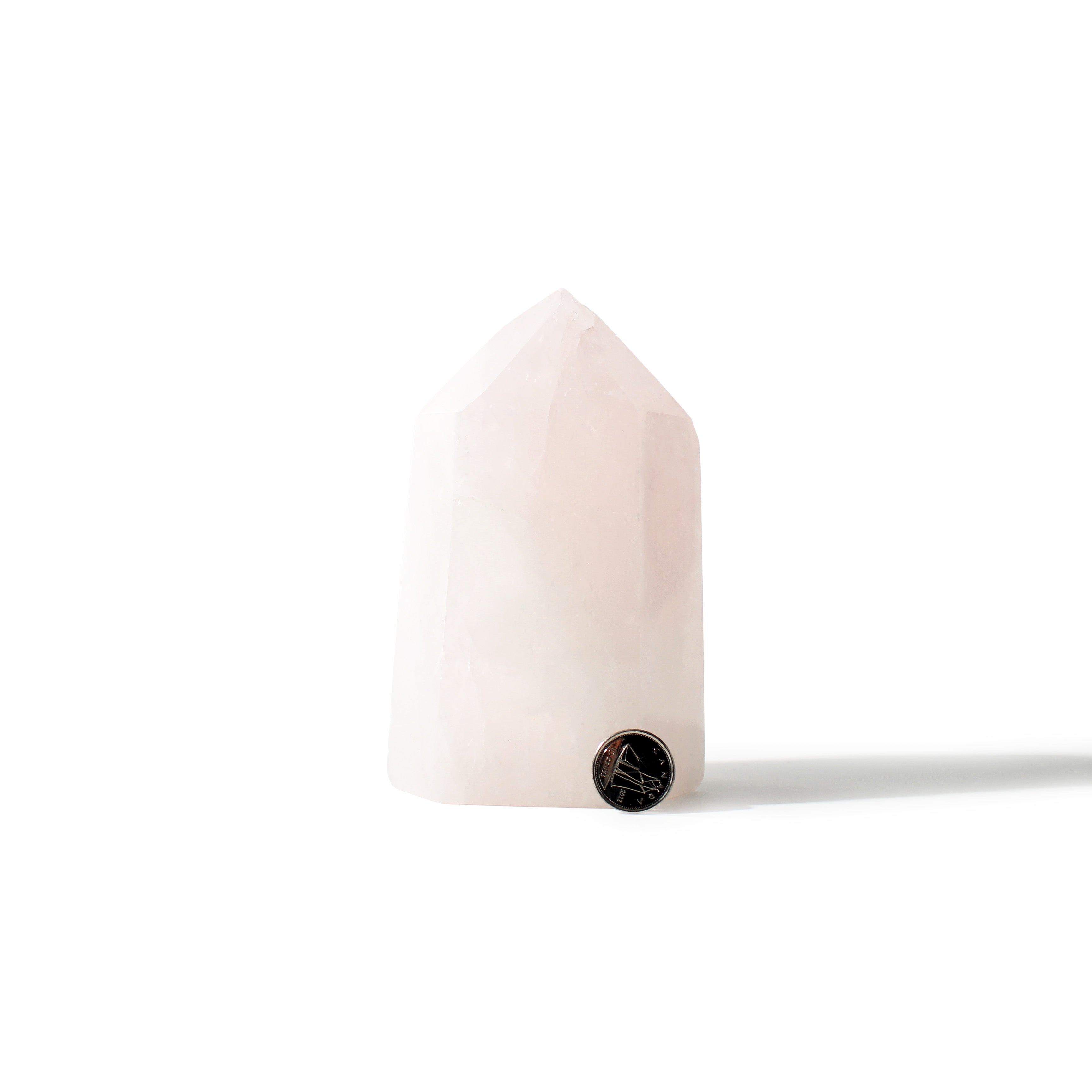 This Rose Quartz Generator stands 5" tall, showcasing soft blush-pink tones with gentle translucency, polished into a smooth, elegant point that radiates calming, heart-centered energy. Each piece highlights Rose Quartz's natural beauty and soothing presence.