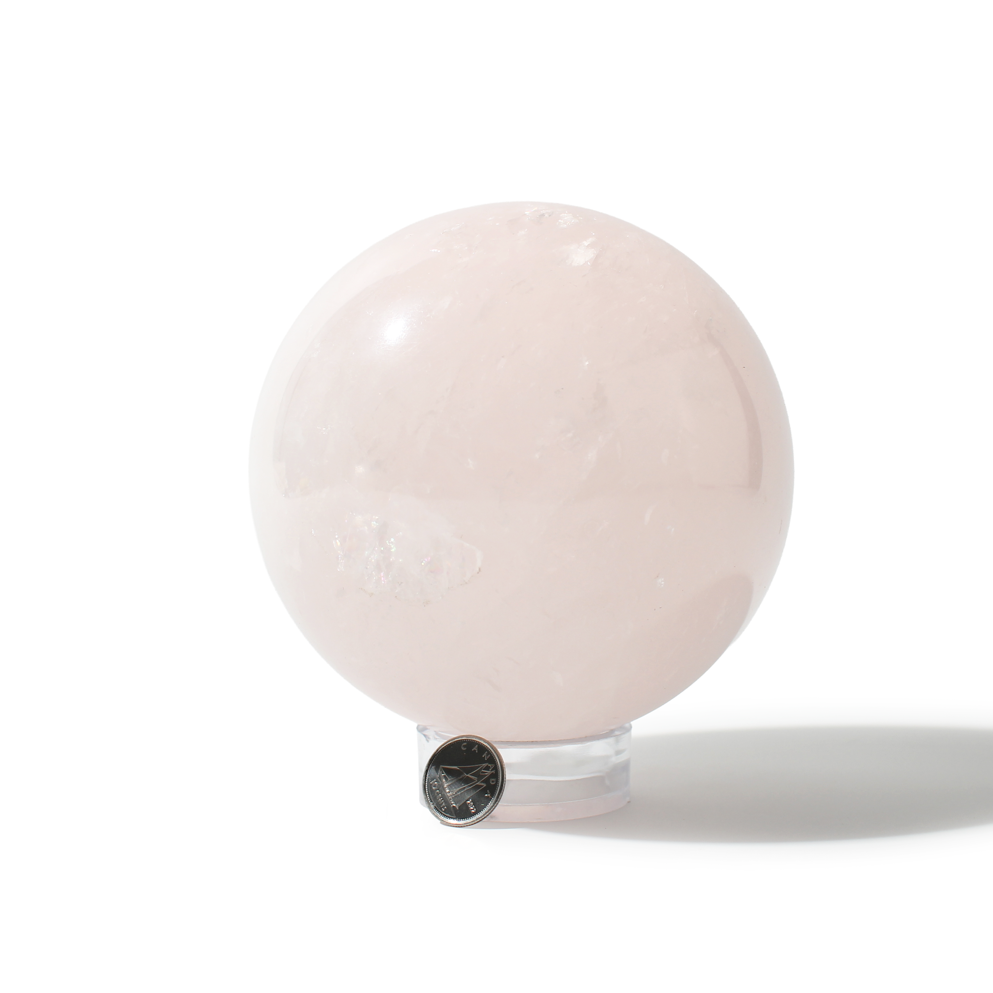 Rose Quartz Sphere Unique #70 - 4 3/8" across and features soft pink tones with a smooth, polished finish. Radiating gentle, loving energy in all directions, it’s ideal for emotional healing and heart-centered spaces.