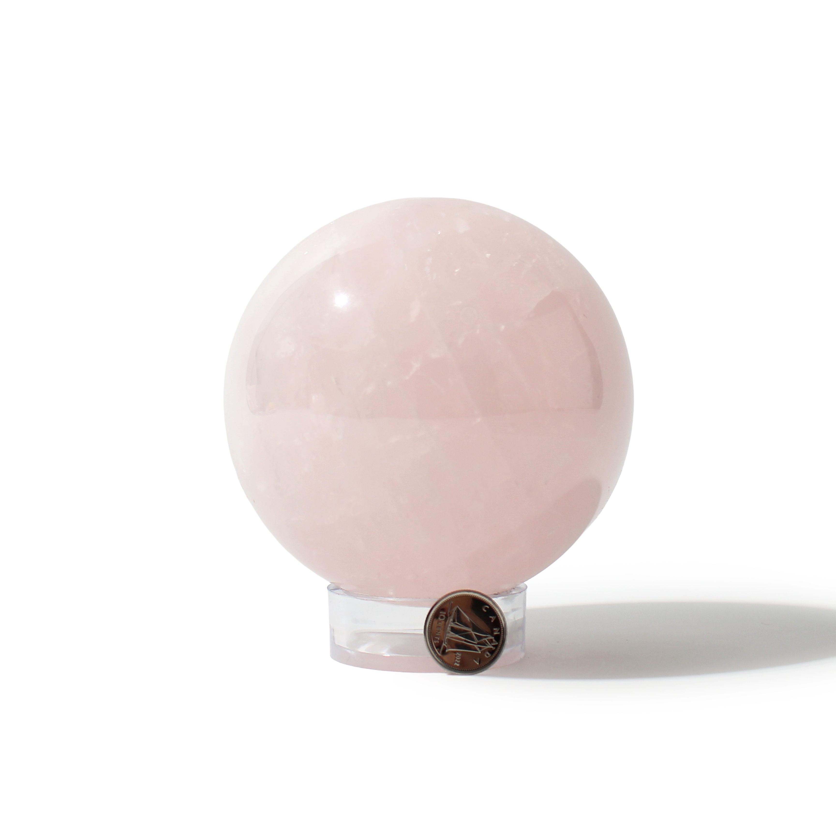 Rose Quartz Sphere Unique #83 - 3 5/8" across and features soft pink tones with a smooth, polished finish. Radiating gentle, loving energy in all directions, it’s ideal for emotional healing and heart-centered spaces.