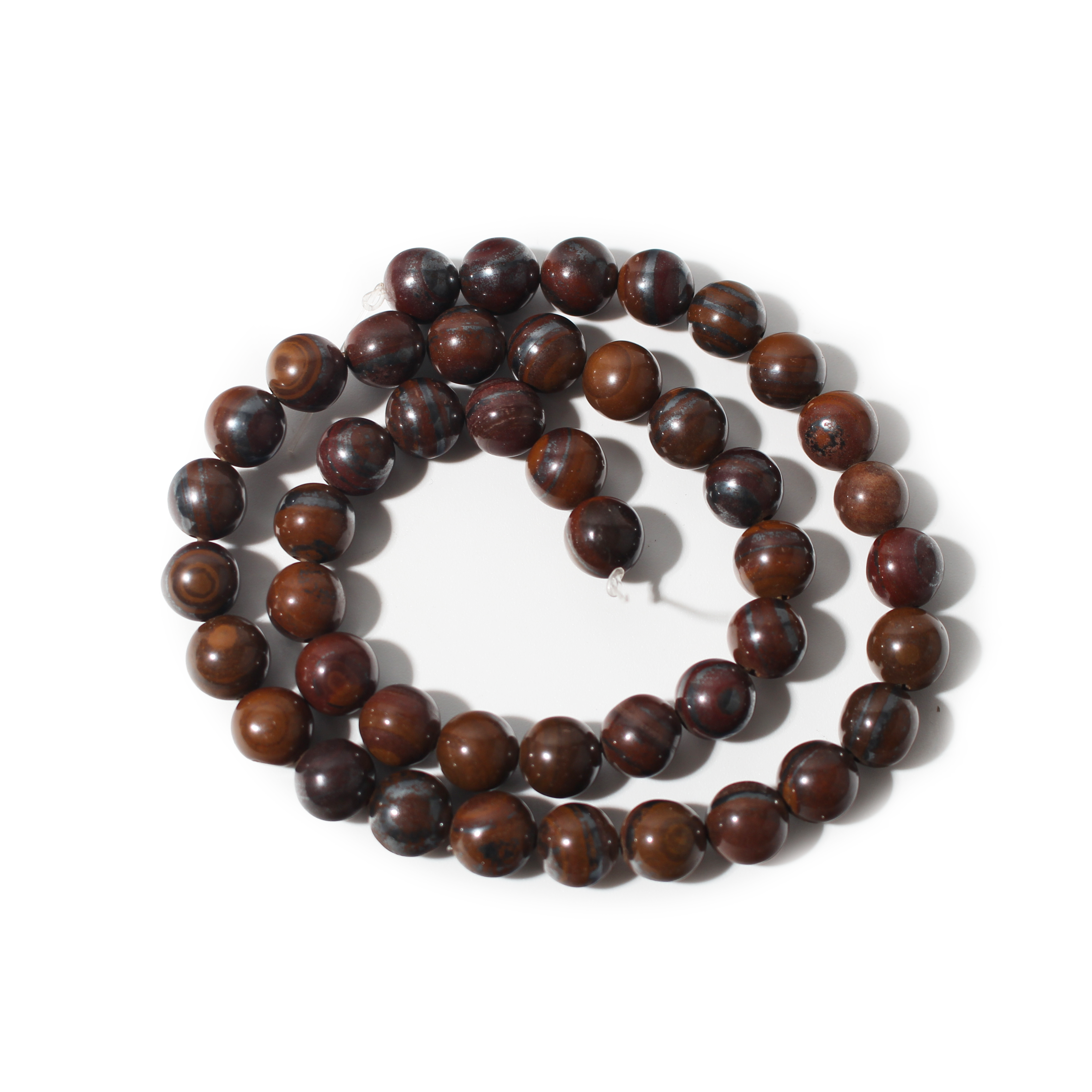 This Tiger Iron Round Strand features polished 8mm beads with bold bands of red, gold, and black, strung along a 15-inch strand that adds strength and visual depth to jewelry designs.