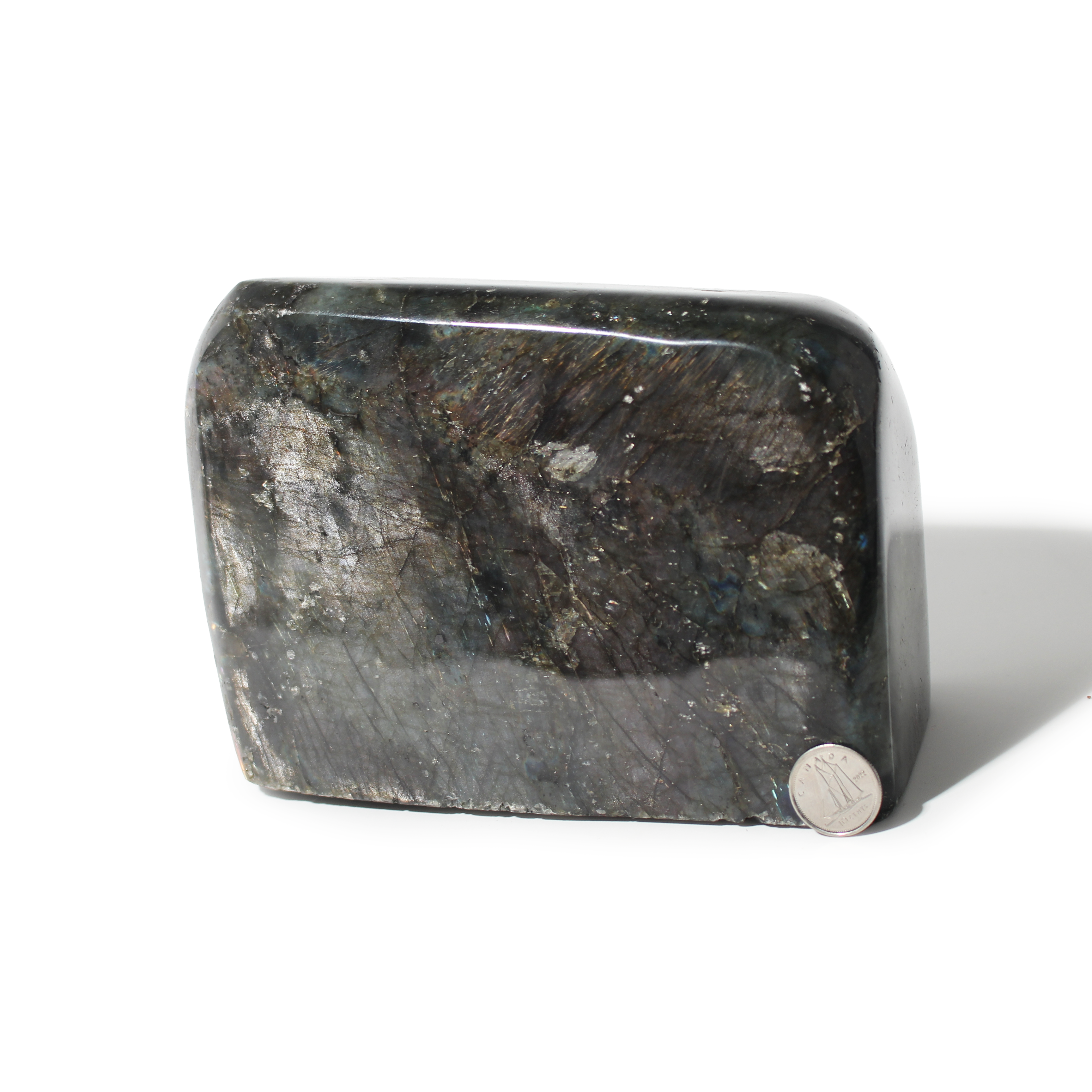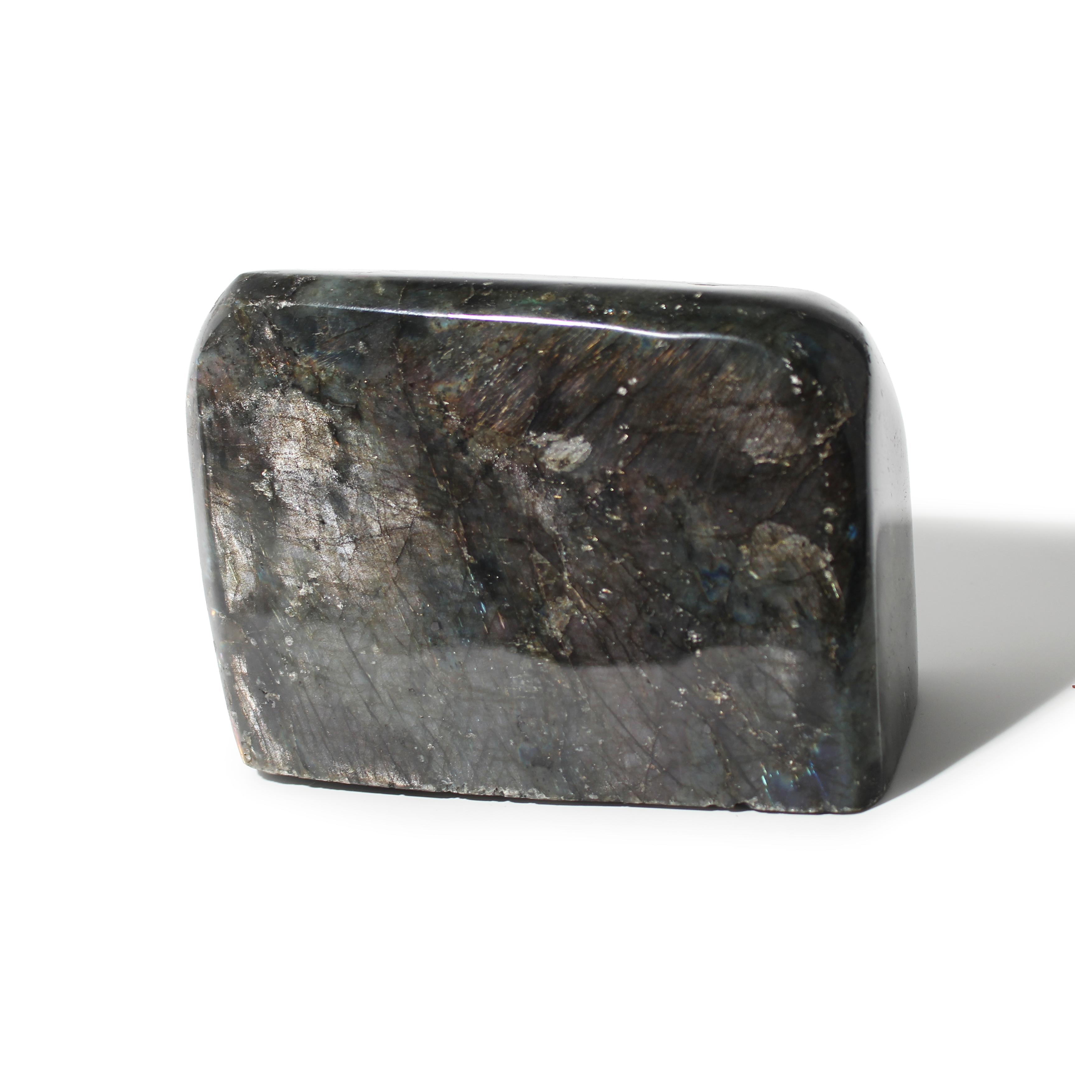 This Labradorite Freeform features smoky grey tones with flashes of blue and green, polished to a smooth surface that highlights its natural sheen and organic shape.