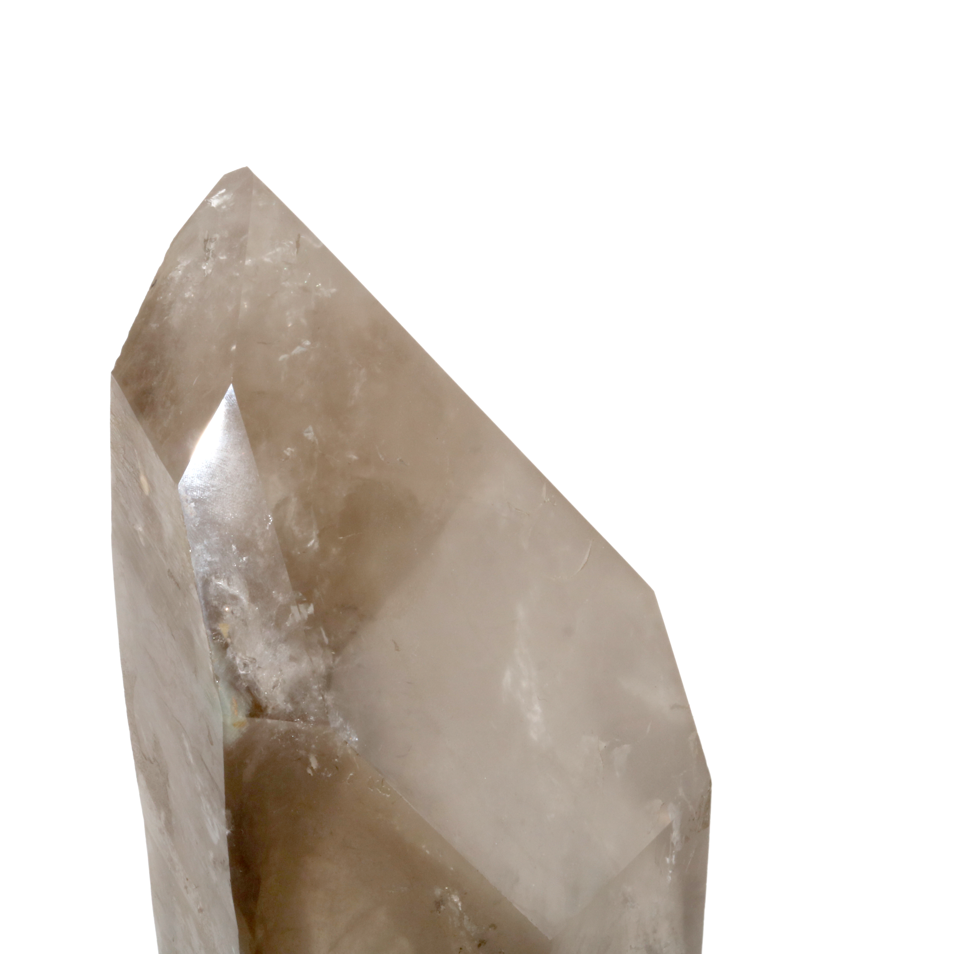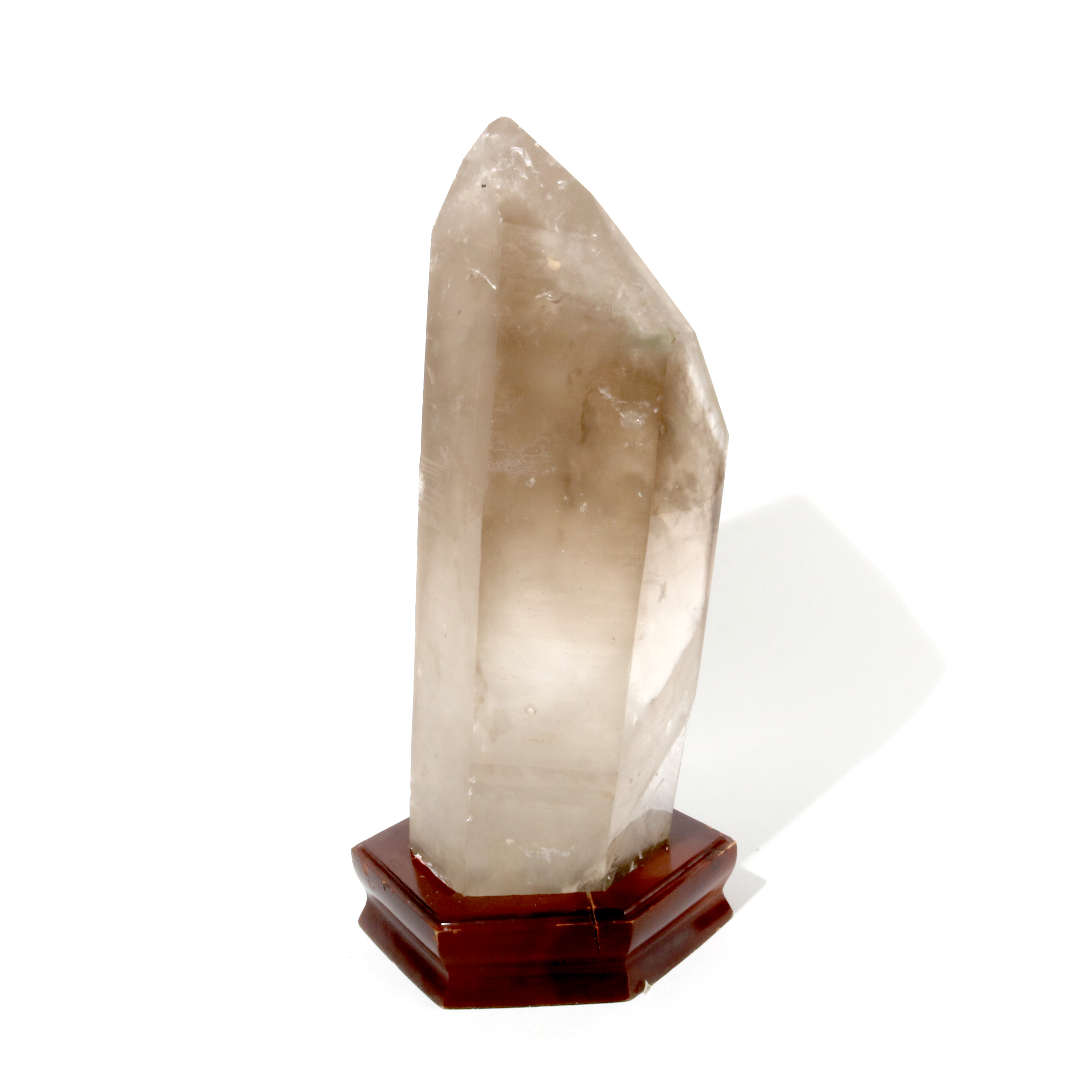 Smoky Quartz crystal with strong clarity and almost transparent grayish-brown or black smoke-like color, Cut with great clarity and a custom carved wooden base, it should be noted that this specimen has a natural cut base requiring a wooden base and a small rainbow near the center of the crystal specimen. The majority of the crystal has a smooth surface with a strong point.