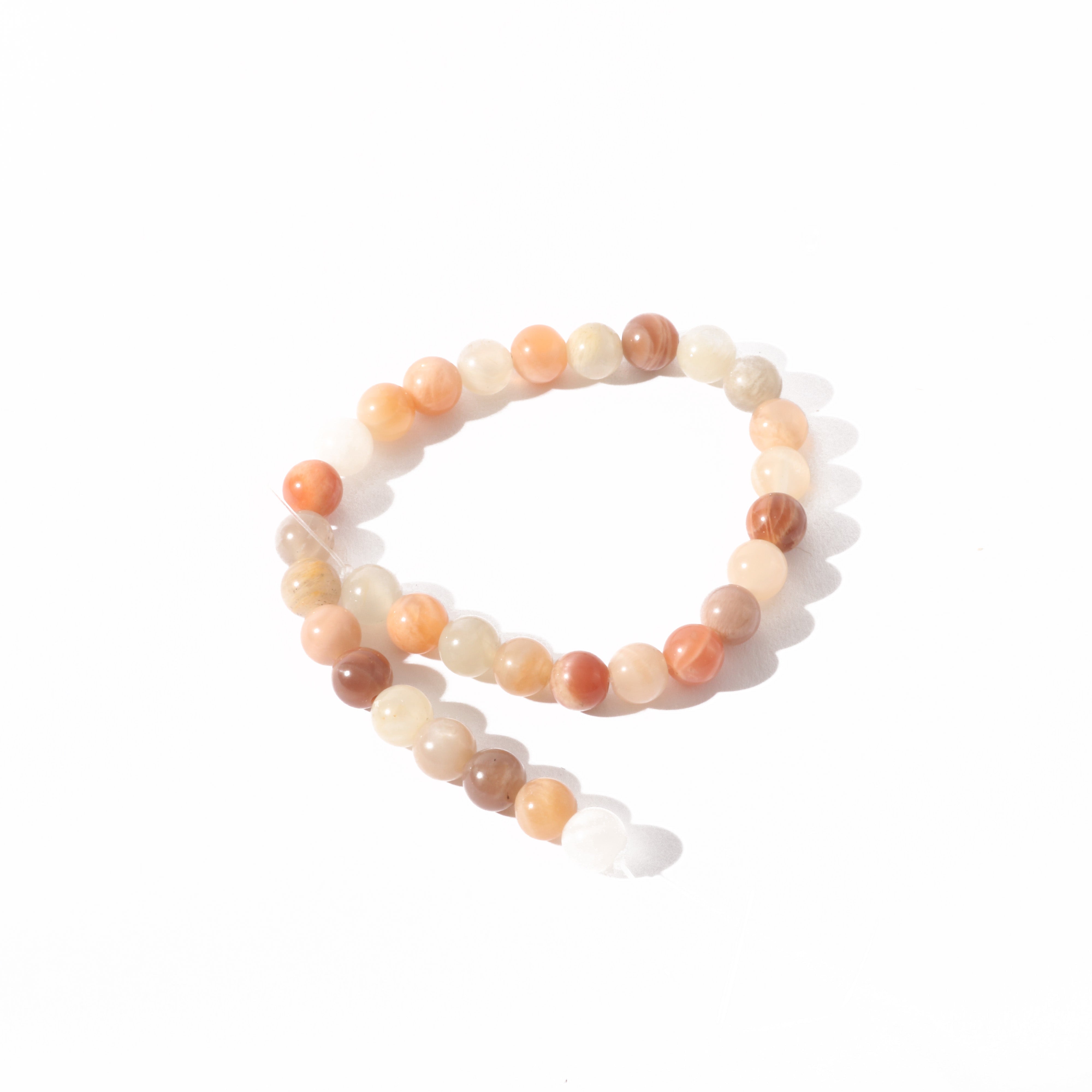 This Sunstone Multi Colour Round Strand showcases a beautiful blend of peach, gold, cream, and subtle grey tones. Each bead shimmers with natural aventurescence, offering a soft sparkle that catches the light.