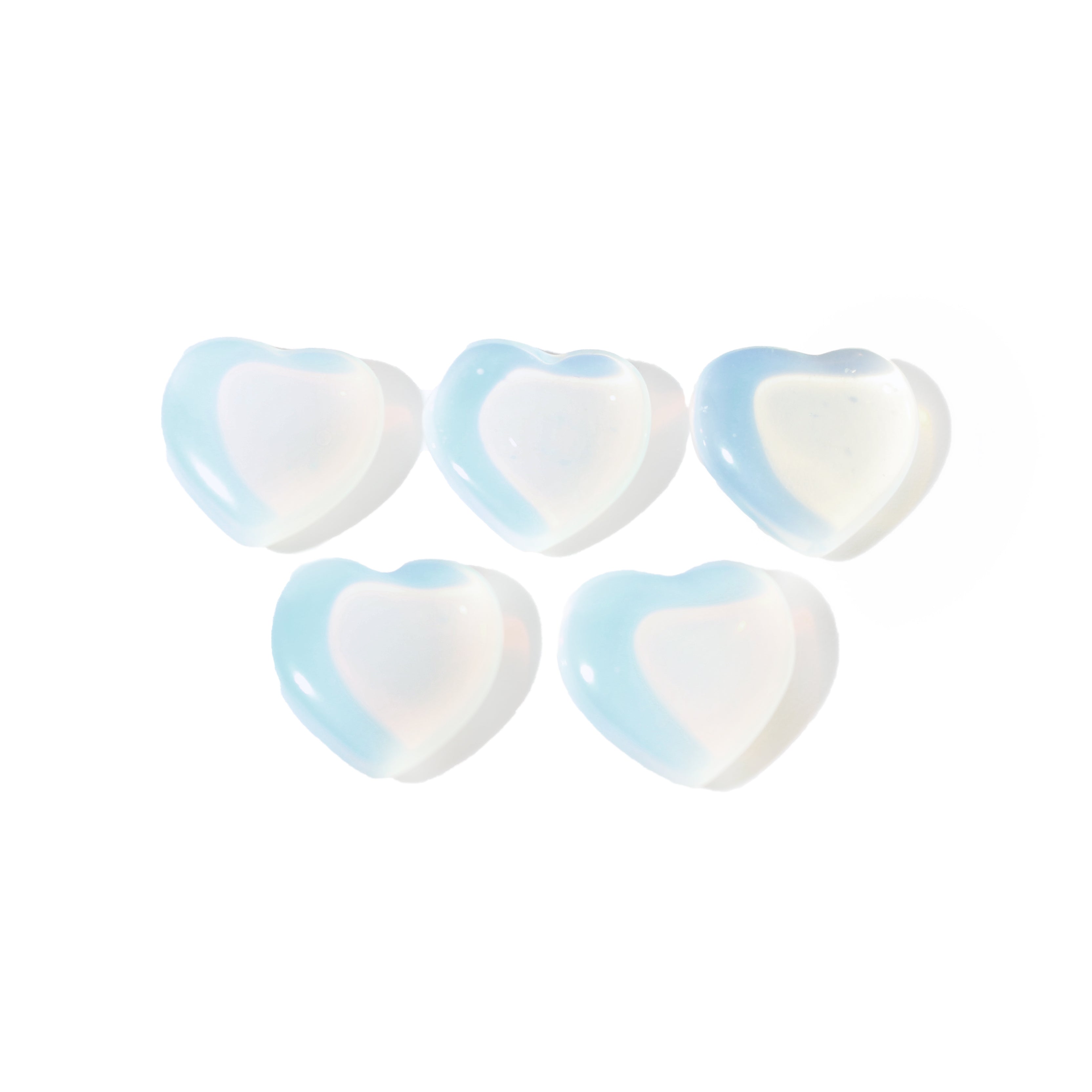This 5-pack of Opalite Heart Mini Carvings features a soft, milky glow with subtle flashes of blue, each polished to a smooth, pocket-sized finish. Petite and radiant, they carry a gentle, uplifting energy.