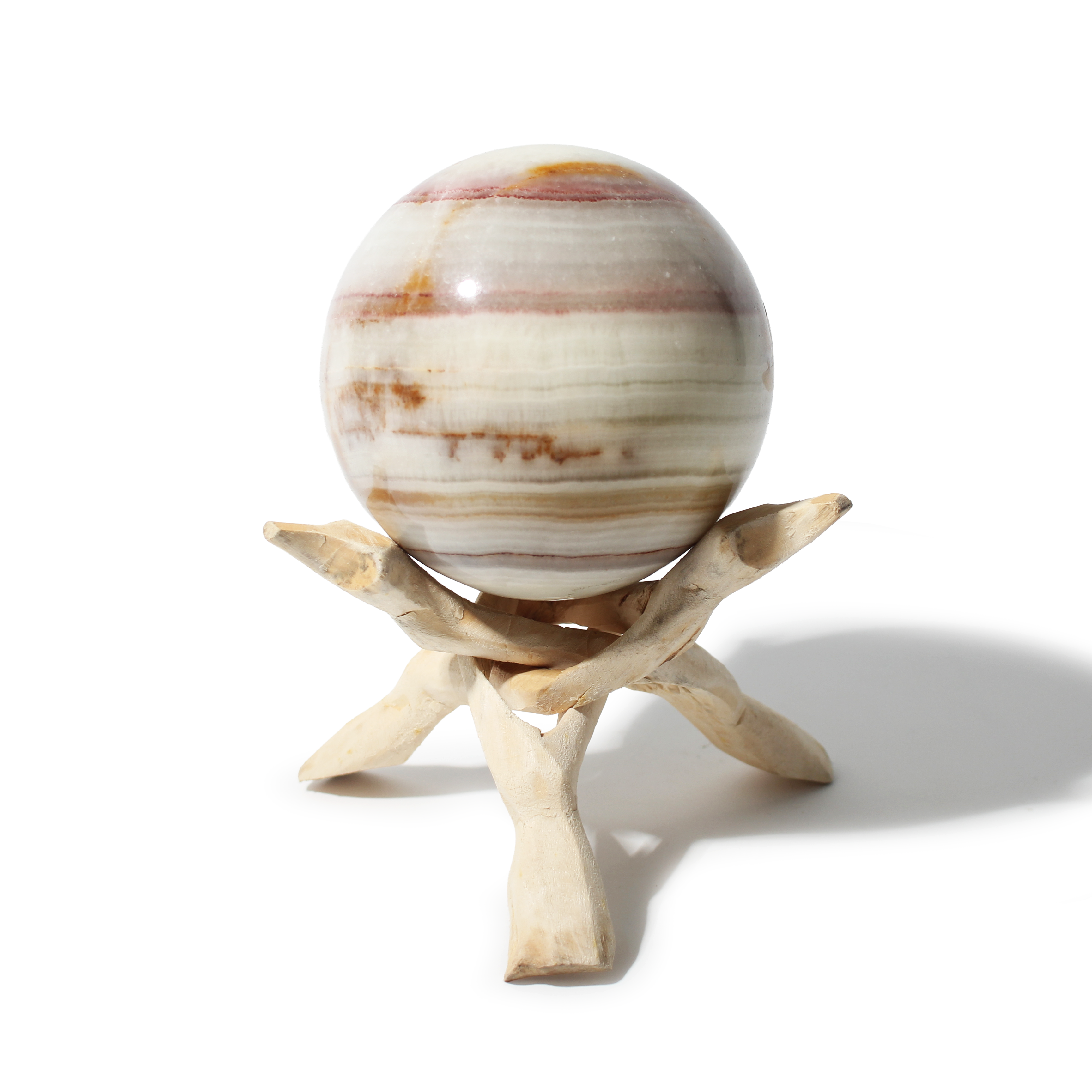 This Banded Aragonite Sphere features layered bands in warm tones of cream, tan, and soft brown, polished into a smooth spherical form that brings a grounding, balanced presence.