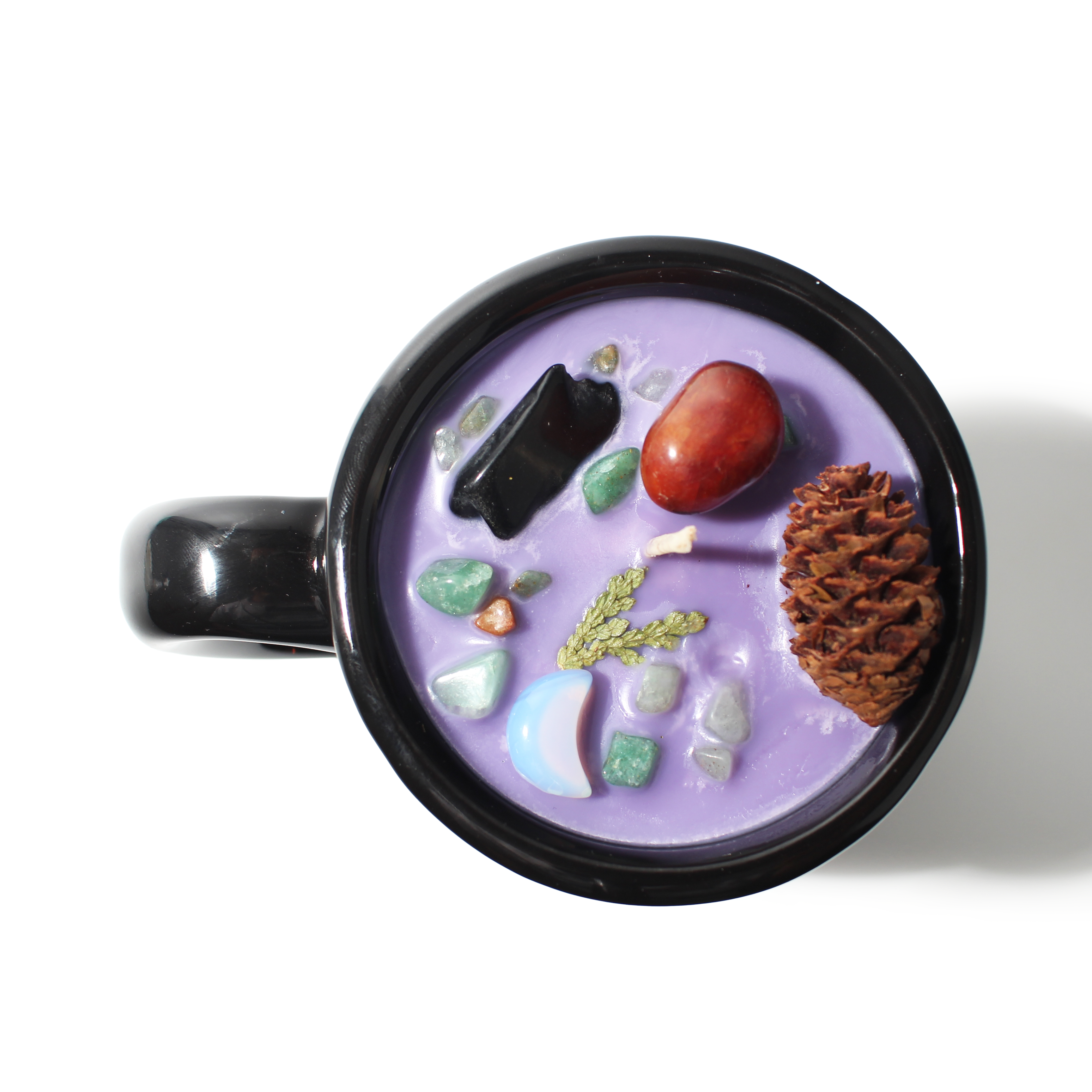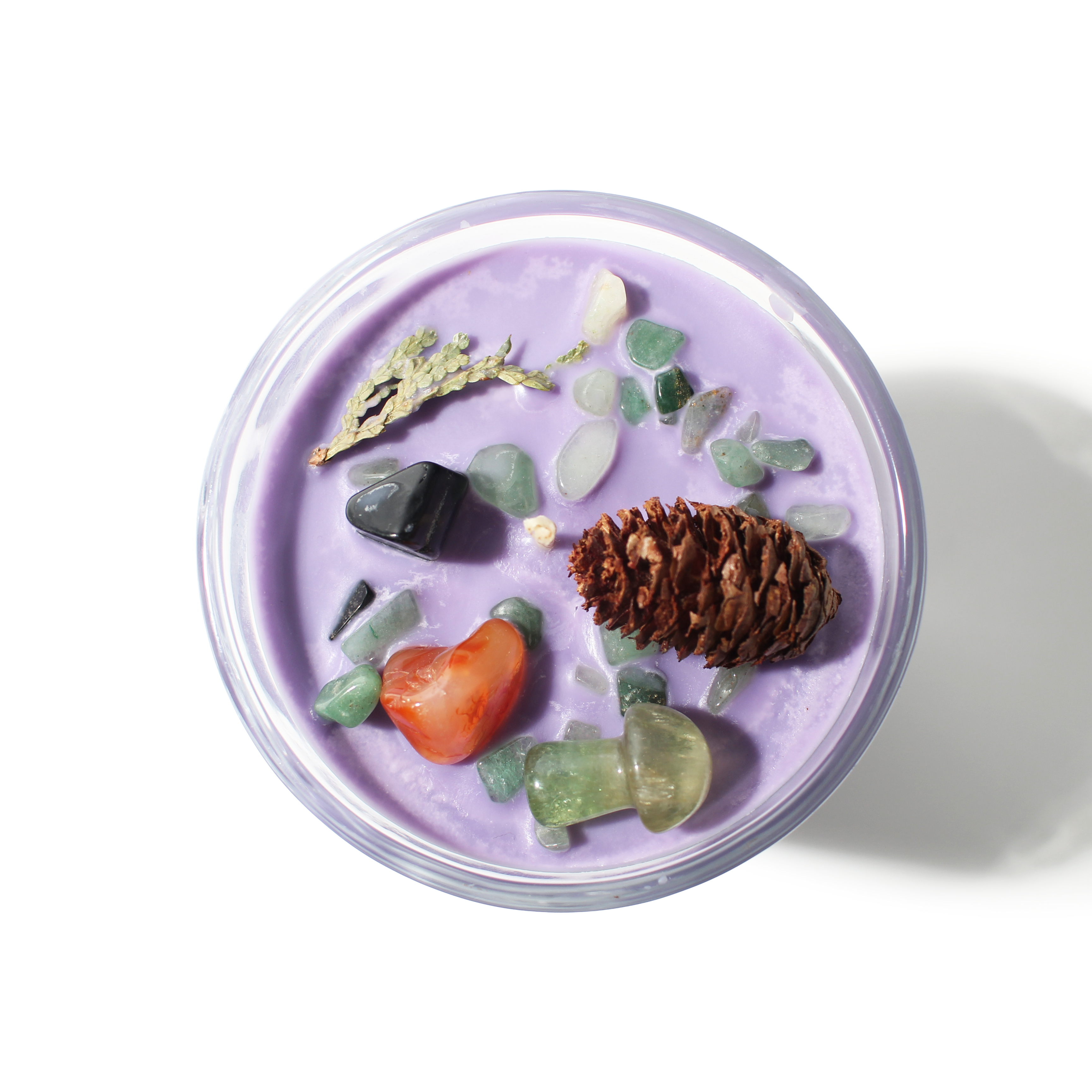 - Skull: For a more eerie touch, our skull candles are also adorned with crushed green aventurine, carnelian, obsidian, and a surprise crystal carving. They also include cedar and a pine cone.