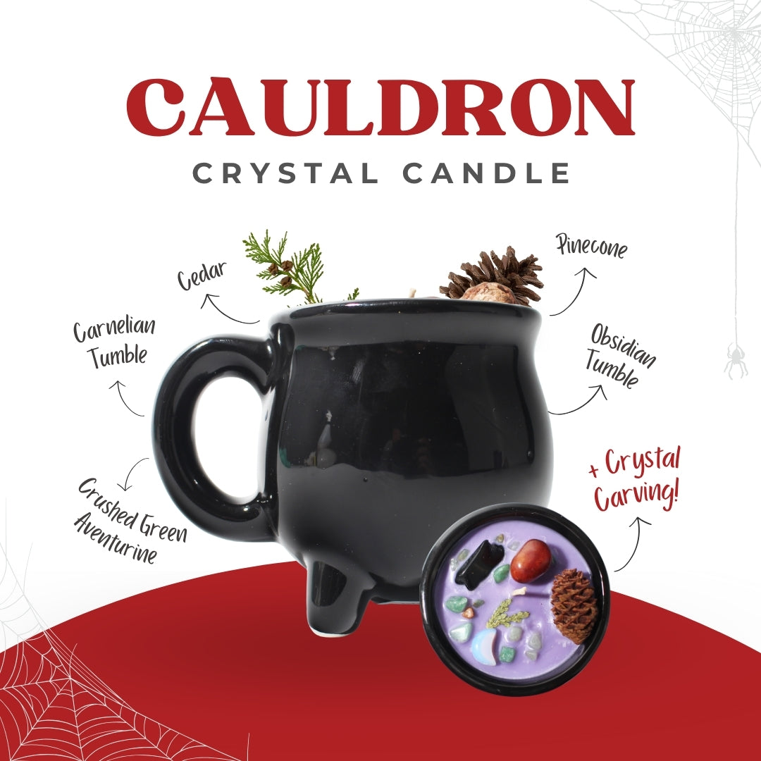 - Cauldron: Topped with crushed green aventurine, carnelian, obsidian, and a surprise crystal carving, enhancing the mystical vibe of your Halloween setup. They also include cedar and a pine cone.