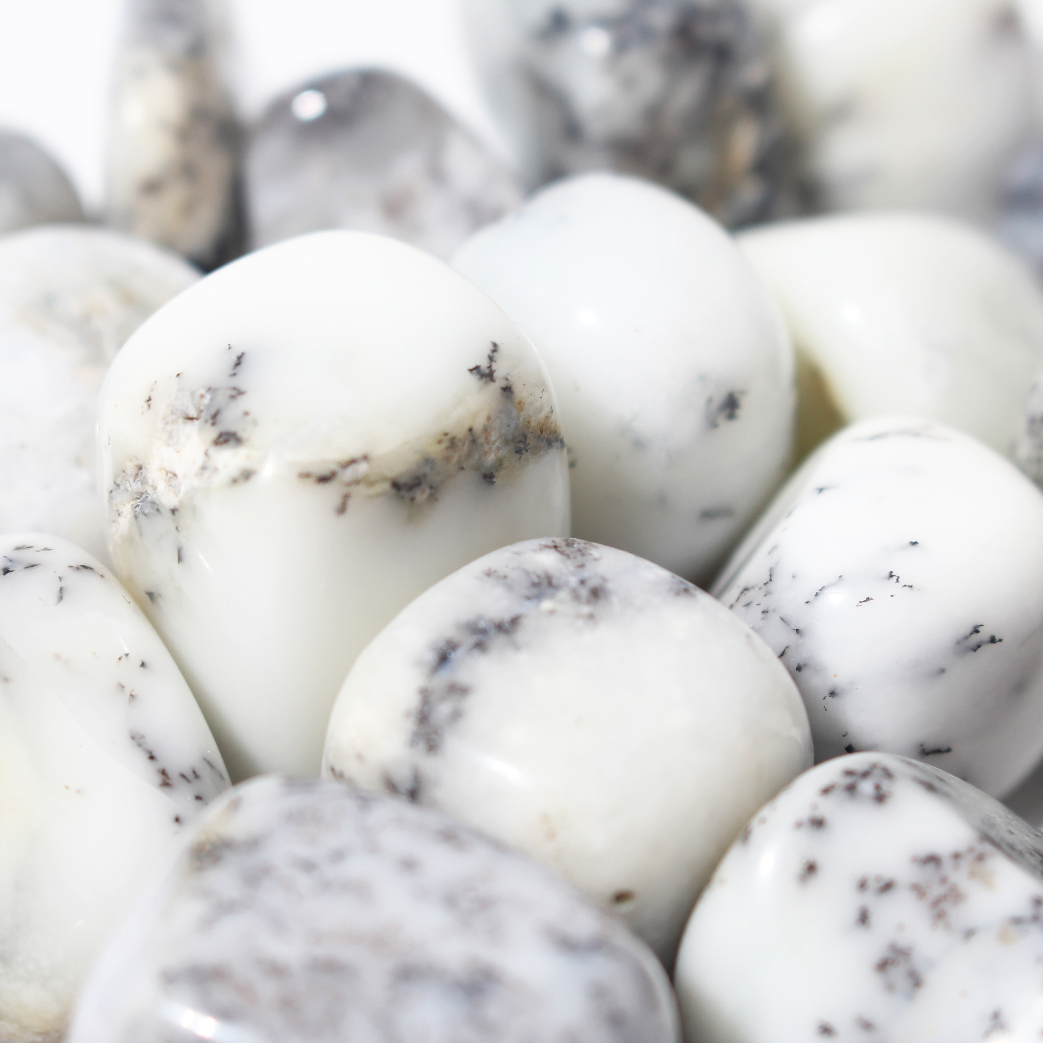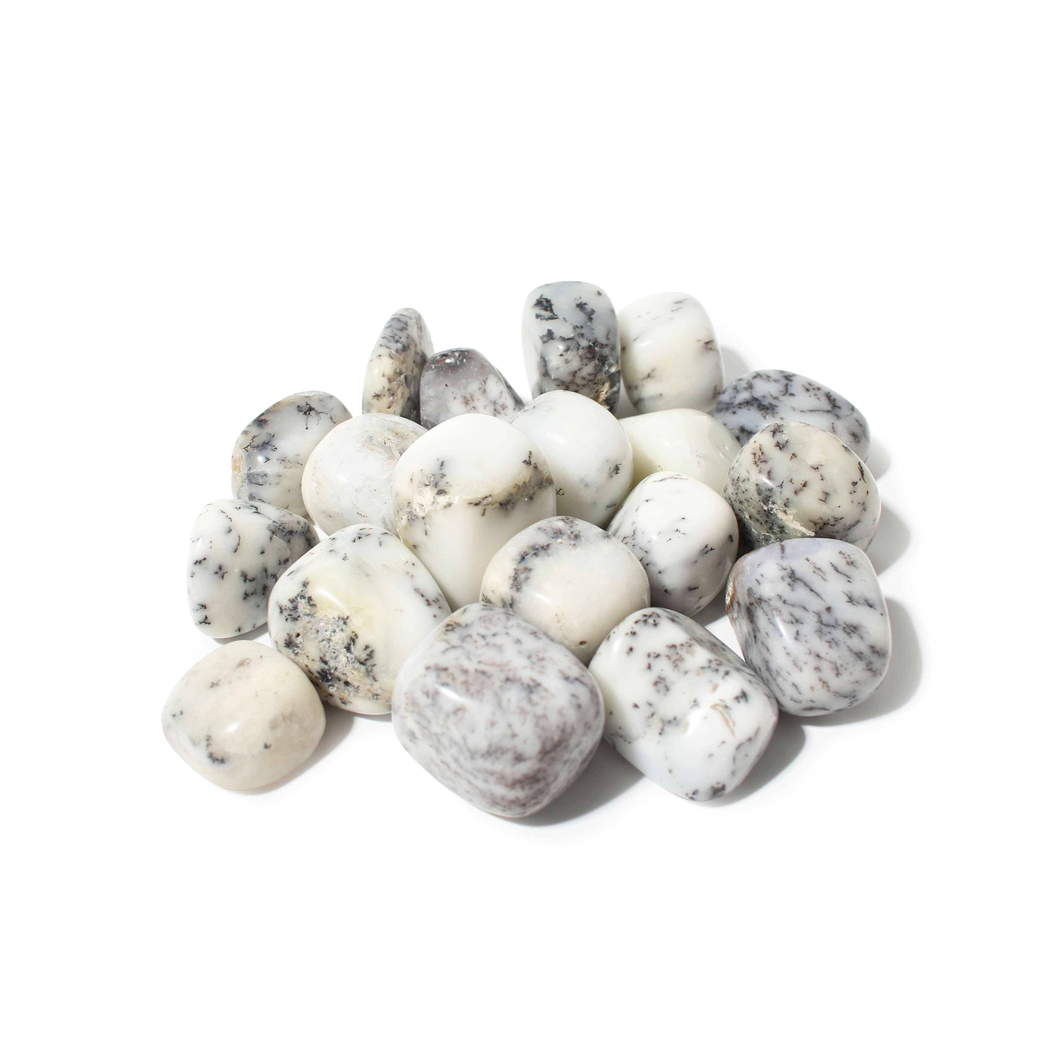 These Dendritic Opal Tumbled Stones feature soft white to light grey tones with natural black or brown dendritic inclusions, polished smooth to highlight their unique, branch-like patterns.
