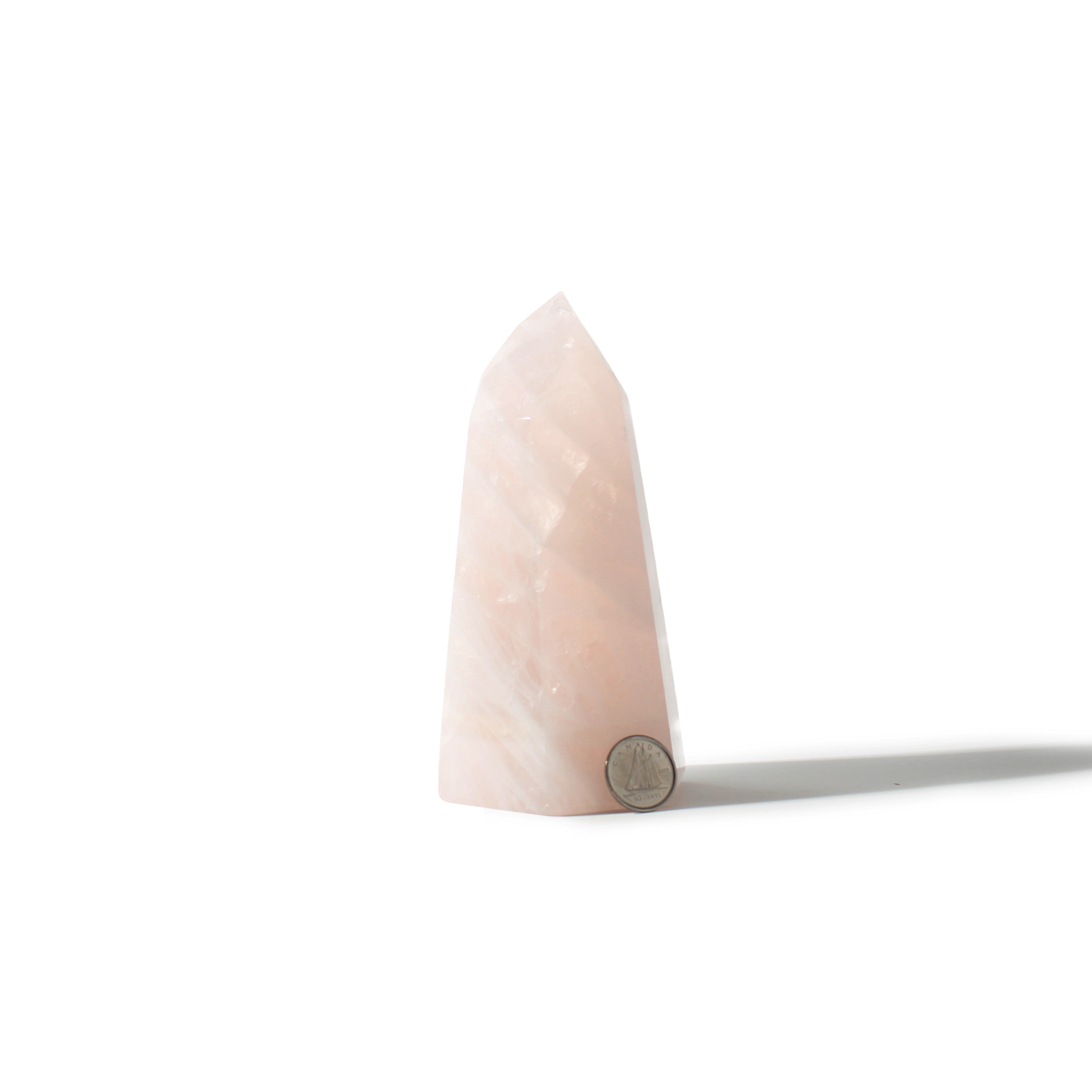 This Rose Quartz Generator stands 5 1/4" tall, showcasing soft blush-pink tones with gentle translucency, polished into a smooth, elegant point that radiates calming, heart-centered energy. Each piece highlights Rose Quartz's natural beauty and soothing presence.