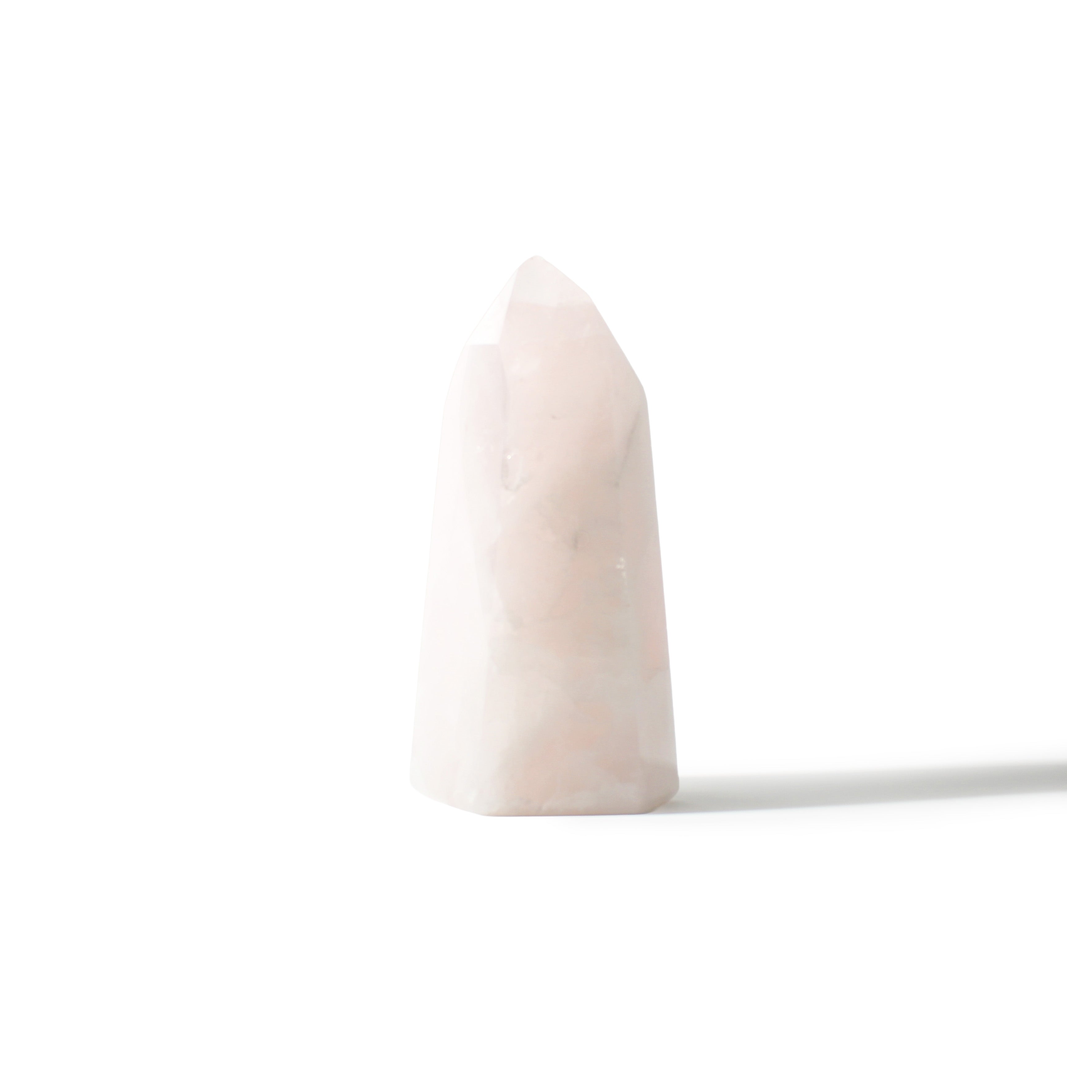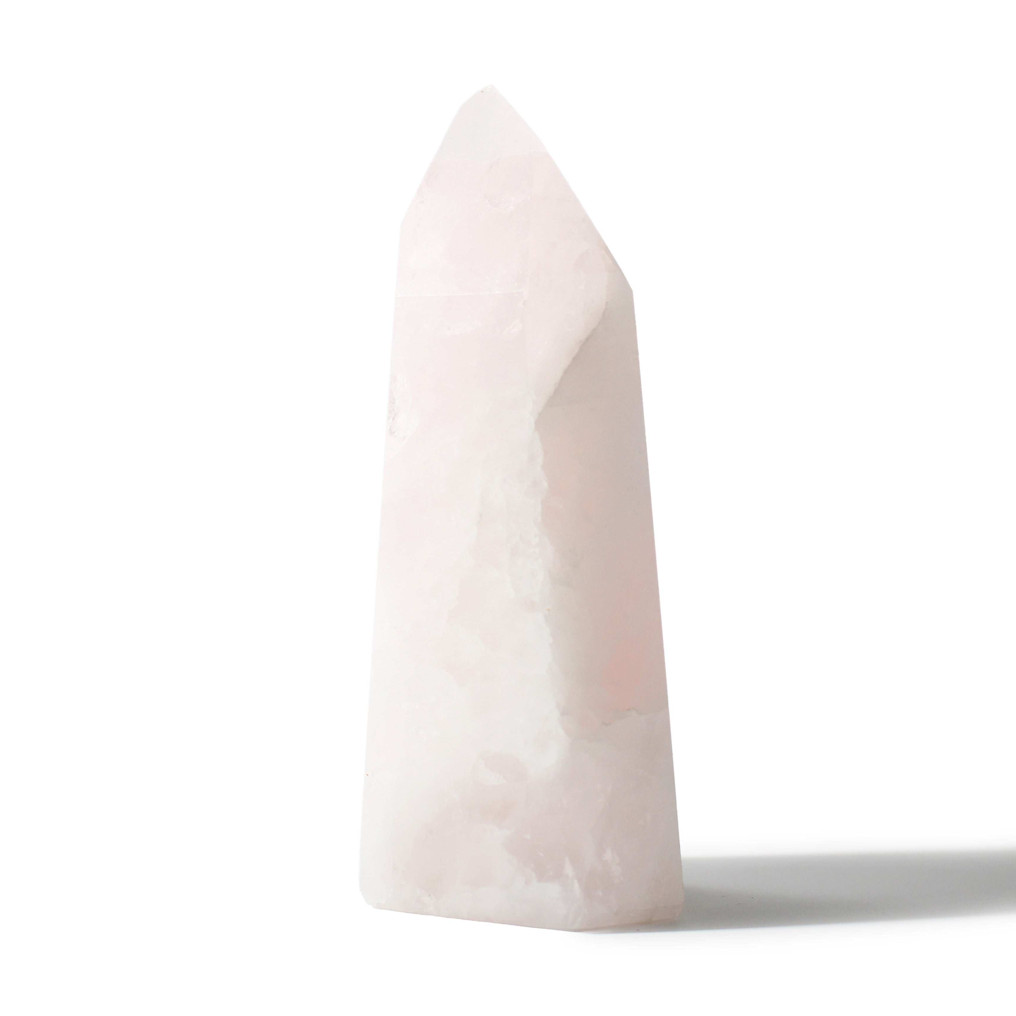 This Rose Quartz Generator stands 5 1/4" tall, showcasing soft blush-pink tones with gentle translucency, polished into a smooth, elegant point that radiates calming, heart-centered energy. Each piece highlights Rose Quartz's natural beauty and soothing presence.