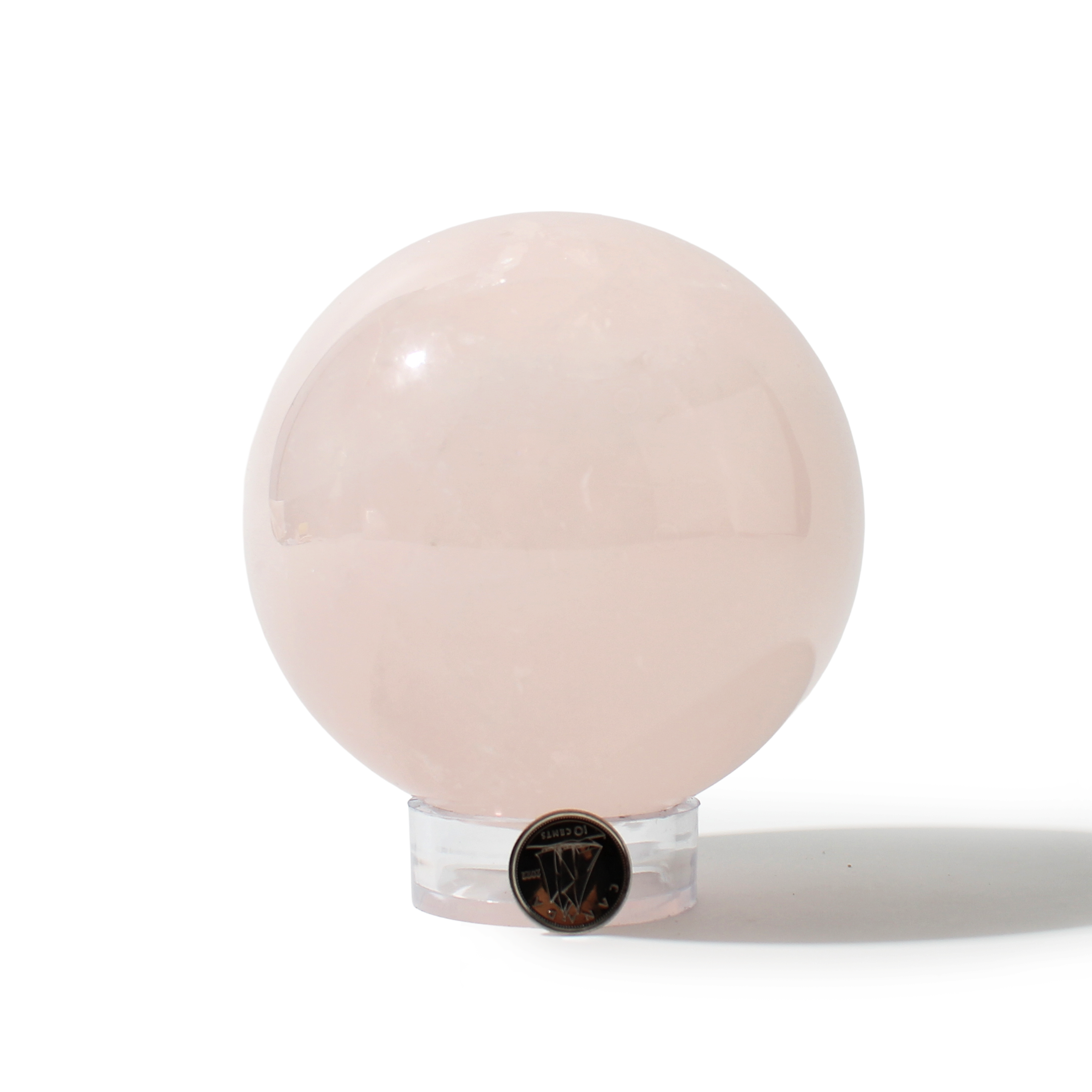 Rose Quartz Sphere Unique #113 - 3 5/8" across and features soft pink tones with a smooth, polished finish. Radiating gentle, loving energy in all directions, it’s ideal for emotional healing and heart-centered spaces.