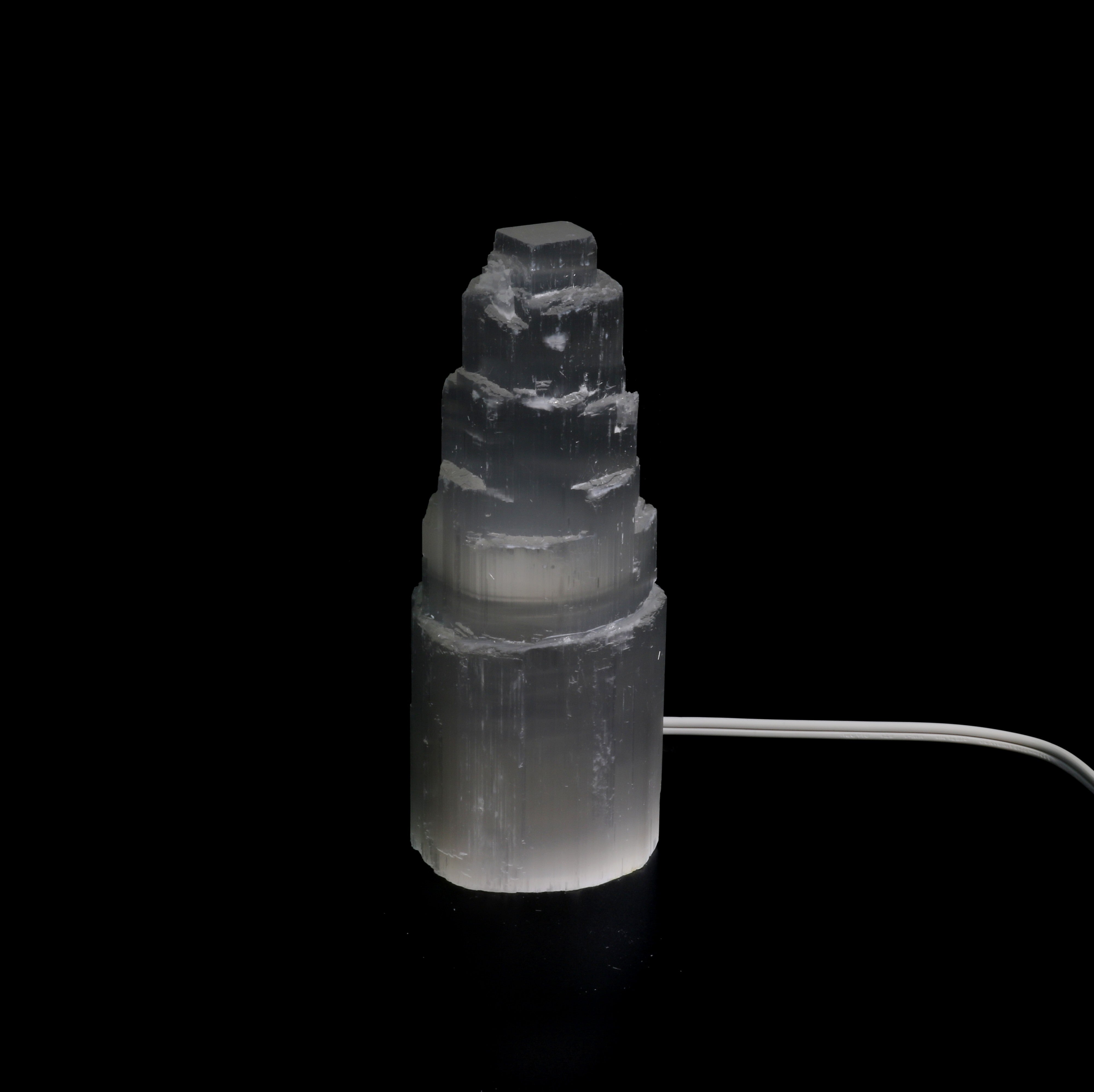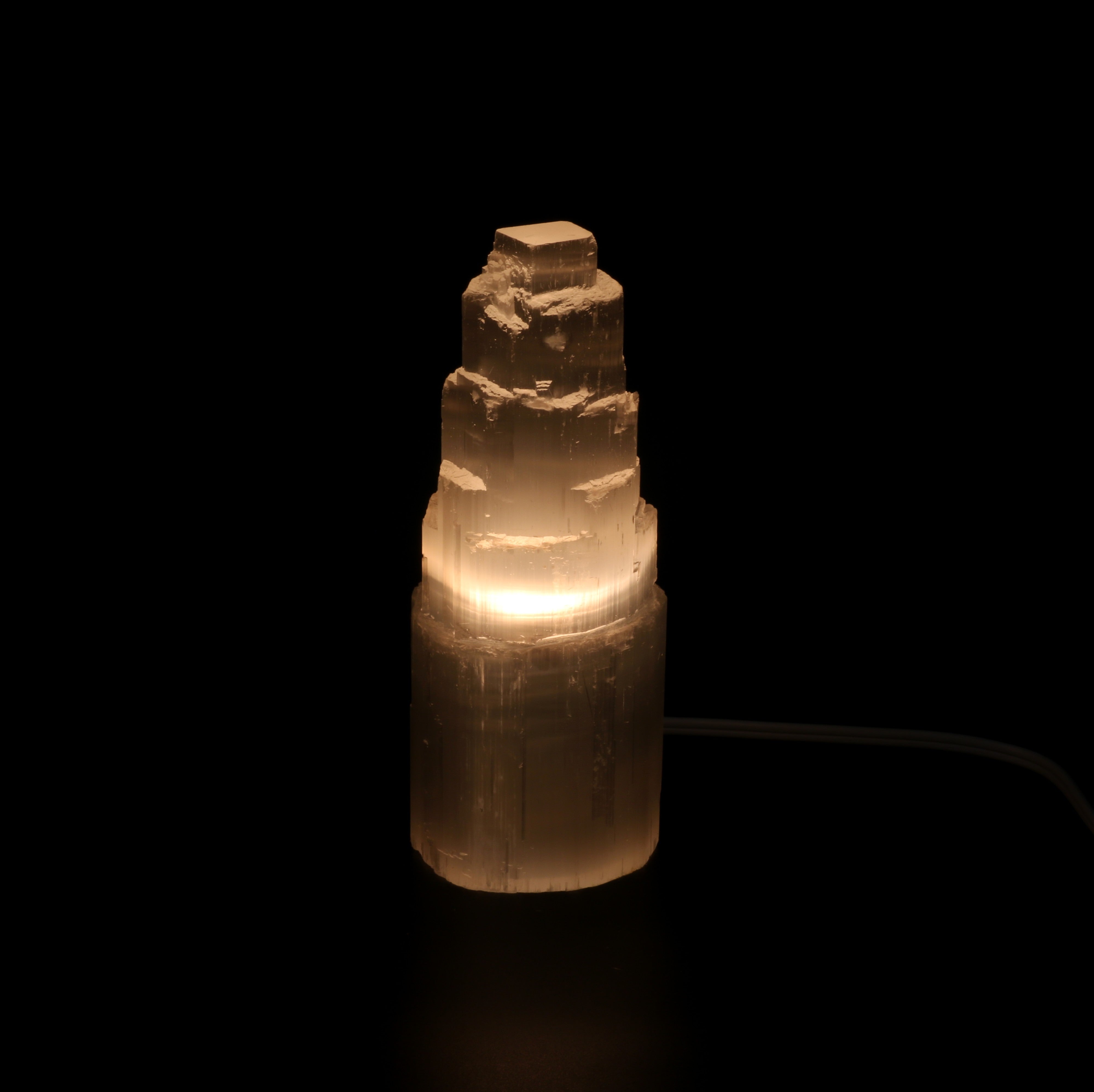 Small Selenite tower lamps have a translucent pearly-white sheen and a soft white glow when lit.