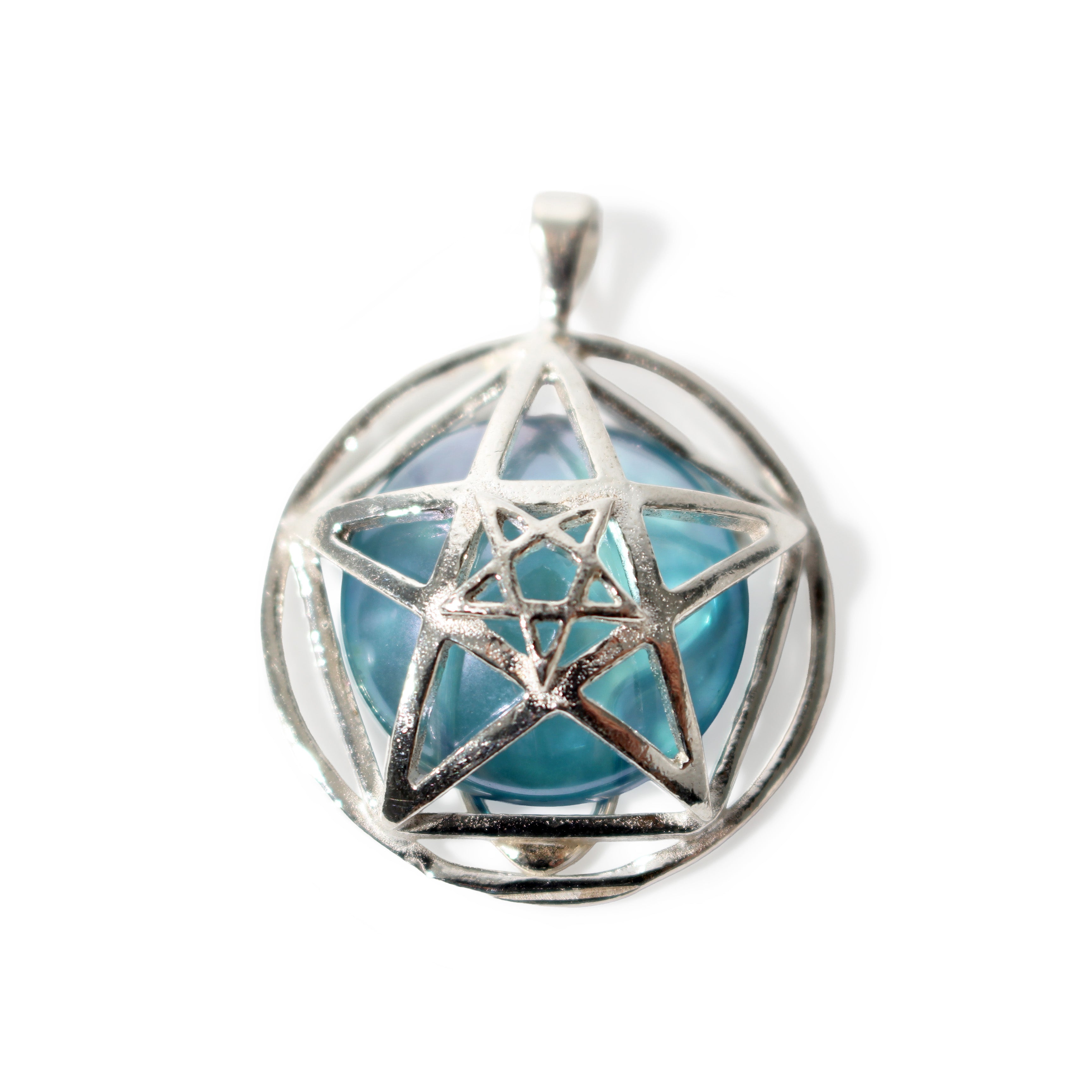 This Aqua Aura Cabochon Double Pentagram Pendant features a glowing, iridescent blue cabochon at the center of an intricate double pentagram design. Both mystical and modern, it radiates protective, high-vibe energy.