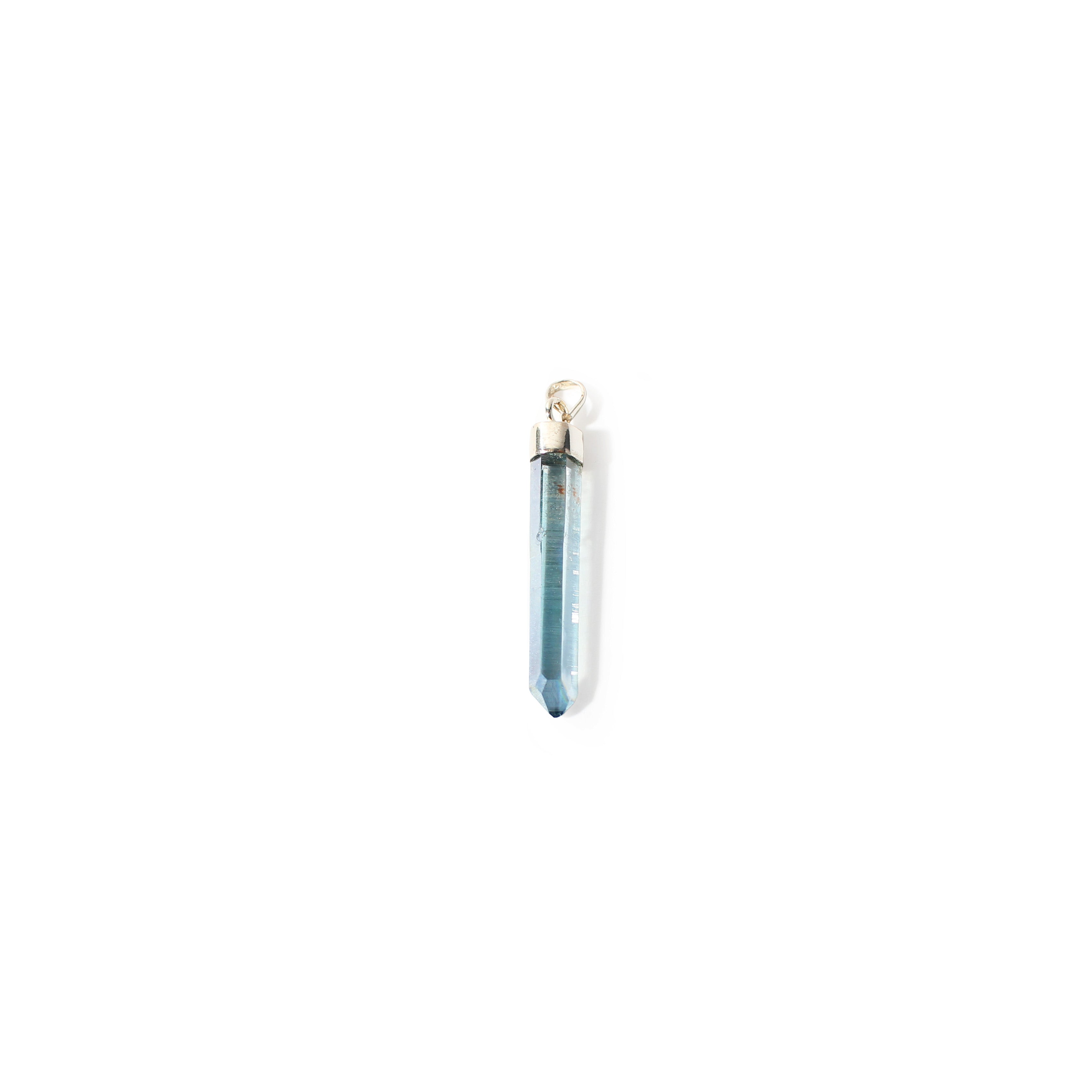 This Aqua Aura Natural Point Pendant features a raw quartz crystal treated with vaporized gold, creating a stunning blue iridescent finish. Its striking glow makes it both ethereal and energizing.