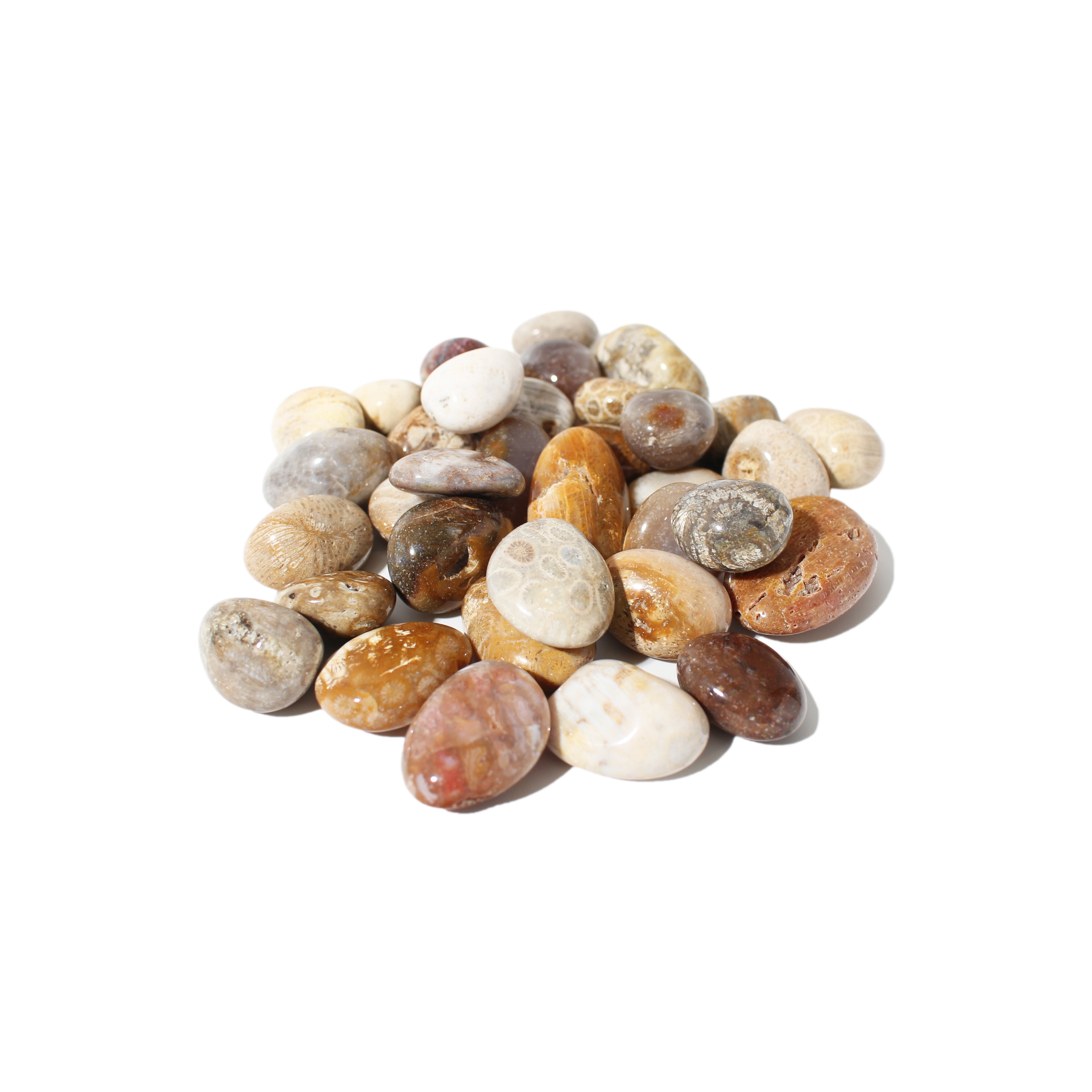 These Fossil Jade Tumbled Stones feature earthy browns, mossy greens, and ancient textures, all polished to a smooth, grounded finish. Each stone carries the quiet wisdom of time and transformation.