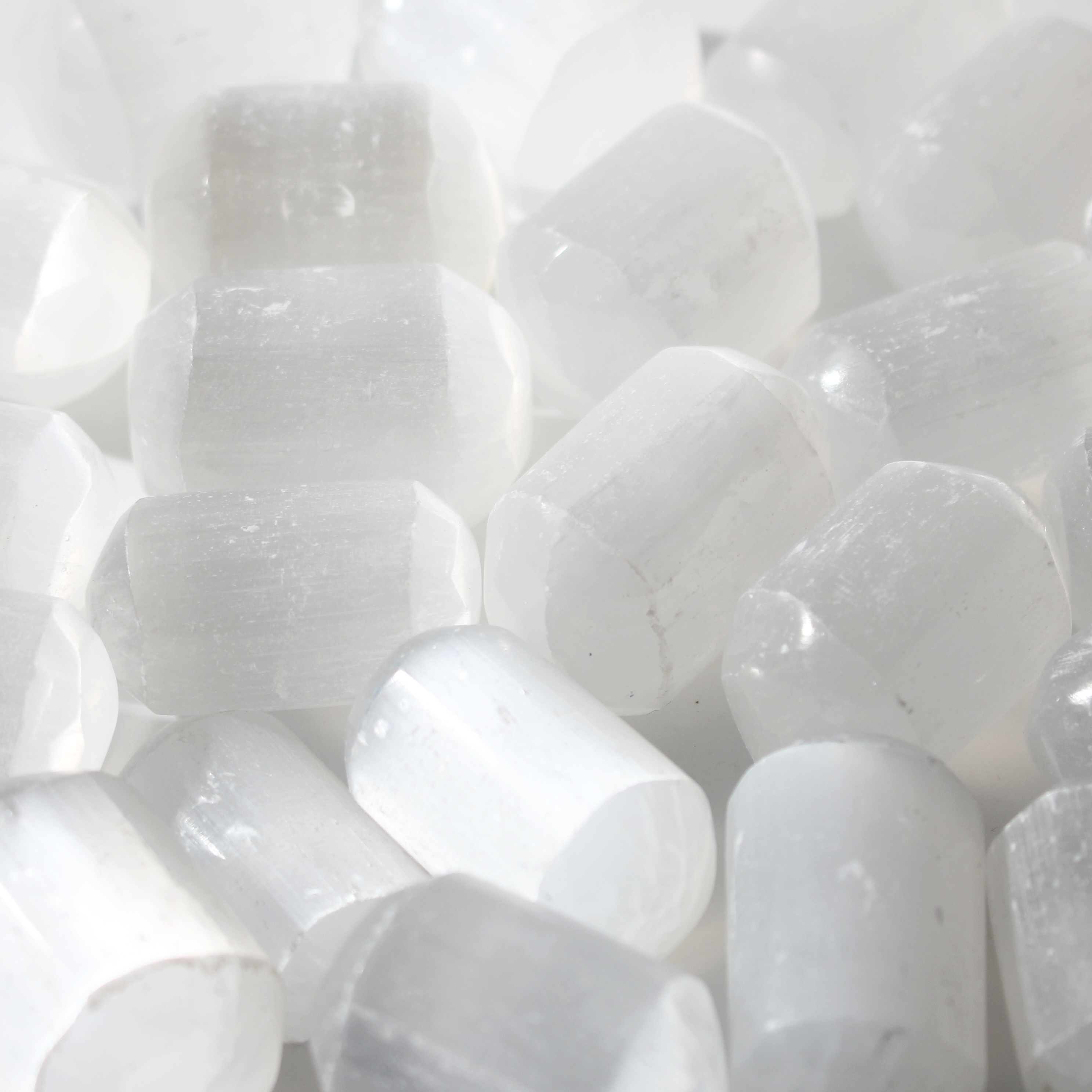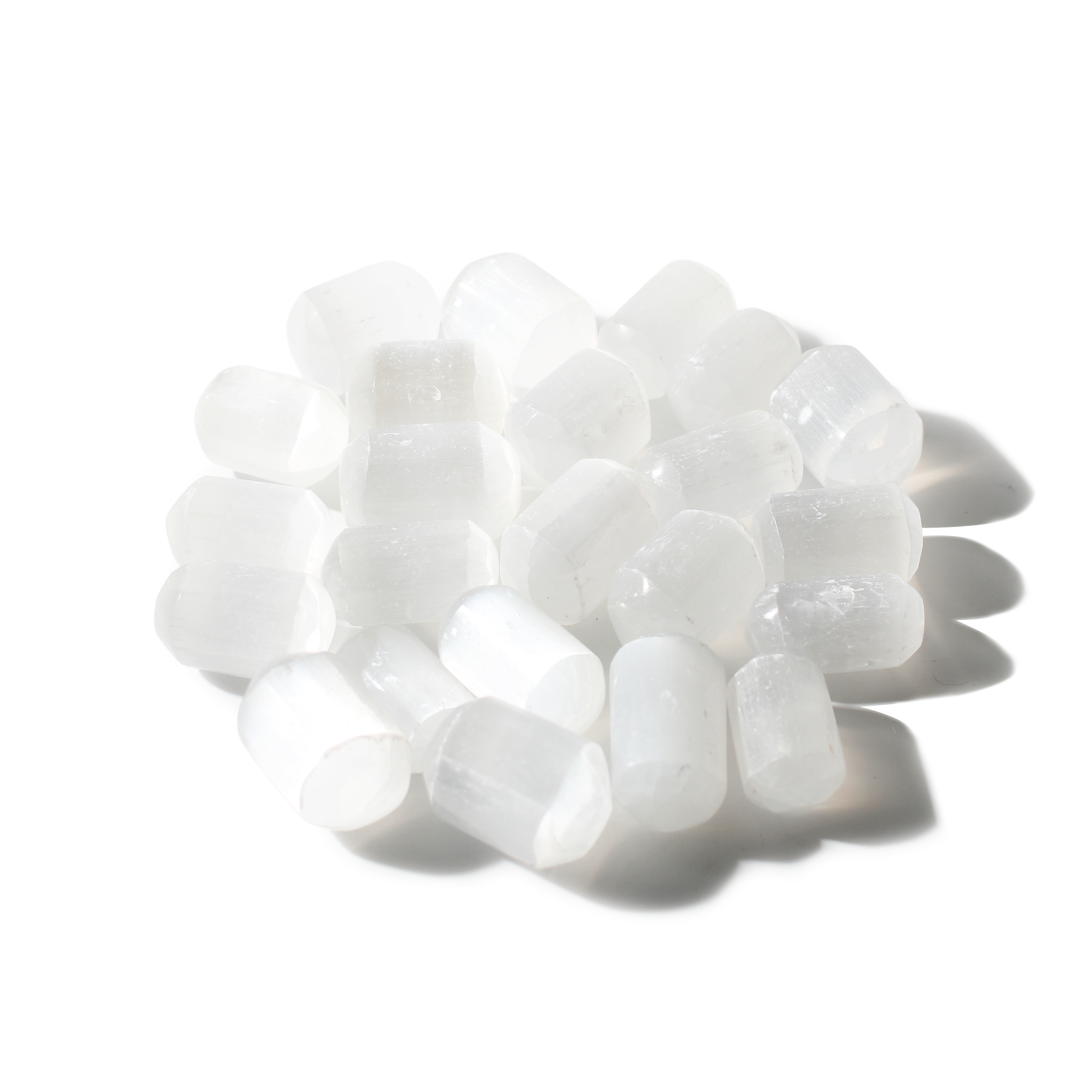 Selenite Tumbled stone is the most common crystal cut and polished shape available. Pieces of stone have been polished to give them a smooth and shiny surface. The shape is irregular and the sizes vary in the form of a nugget.