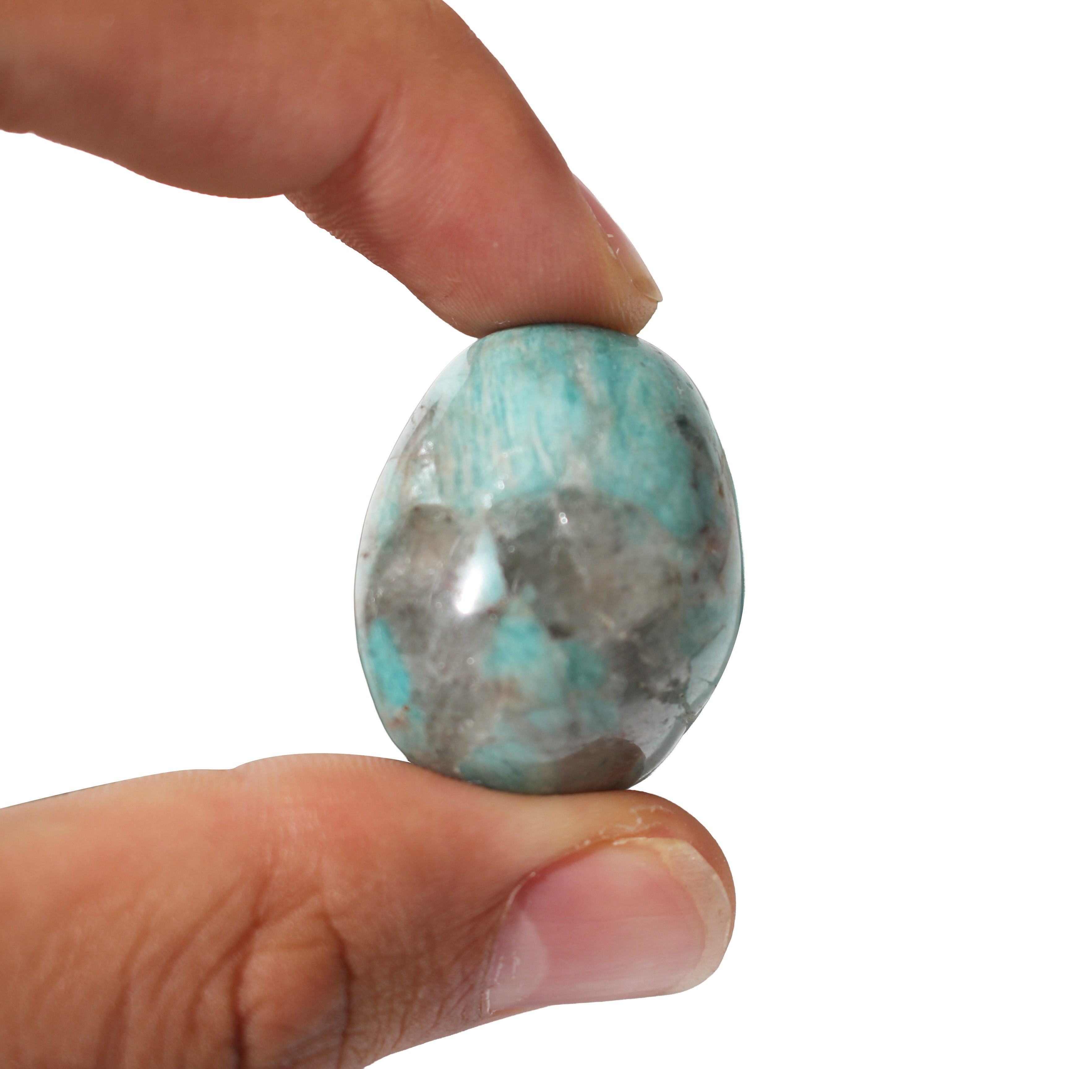 These Amazonite with Smoky Quartz Tumbled Stones combine soothing aqua tones with rich, grounding greys. Polished to a smooth finish, each stone offers a unique blend of calm and stability in your hand.