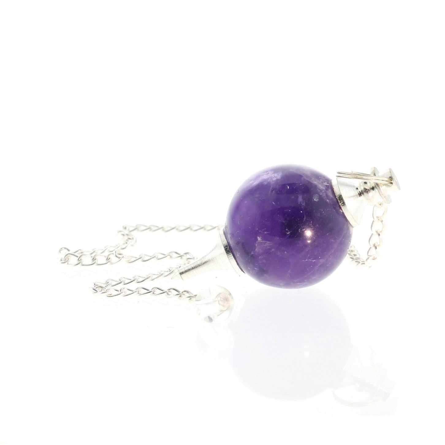 This pendulum is made of an amethyst stone that is carved and attached to a metal bail. The stone appears a wine-shaded purple, though it can and will be as pale as lavender, with some shades of a washed white tone.