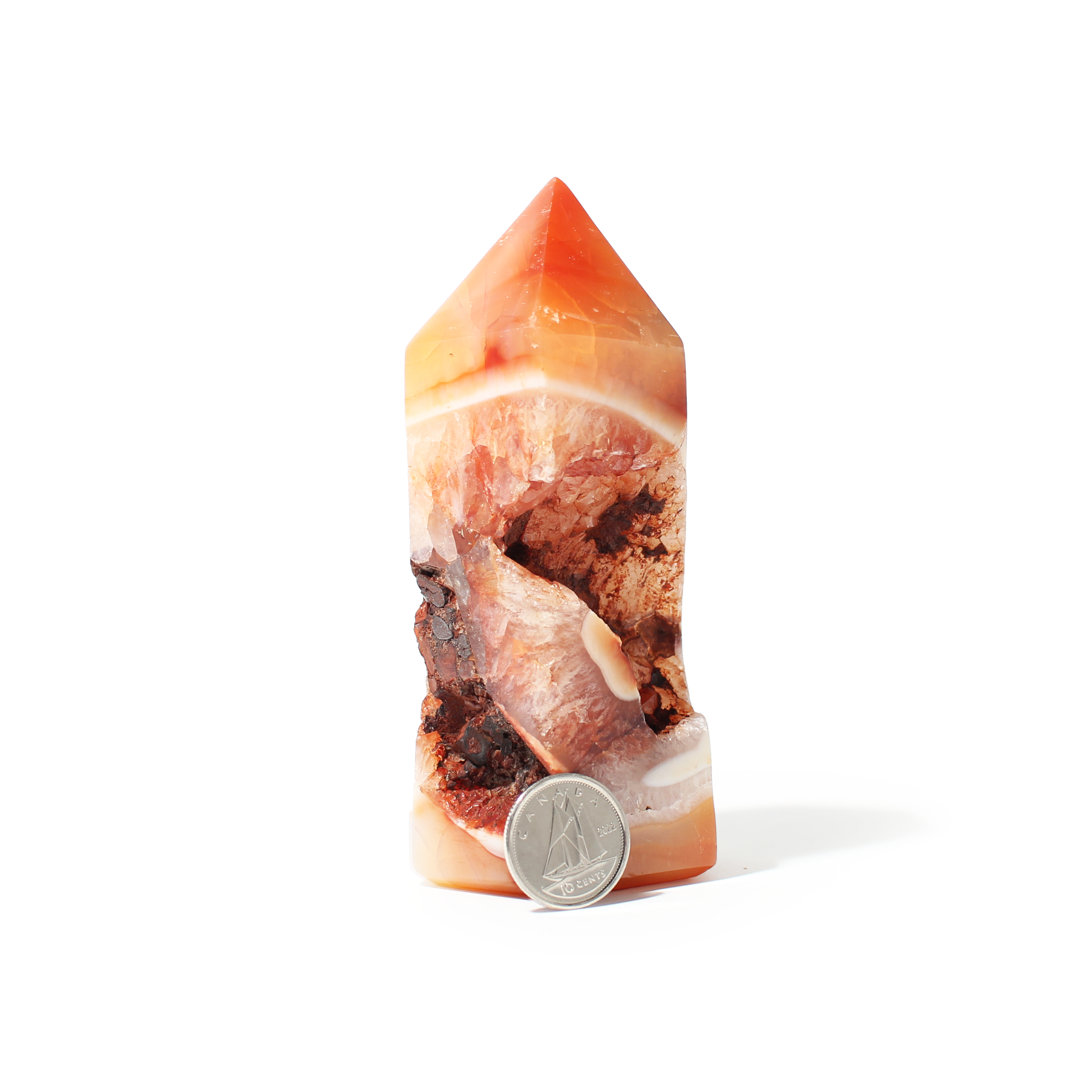 This Carnelian Generator showcases vibrant shades of fiery orange, deep red, and warm amber, polished into a striking point that’s perfect for both energy work and retail displays.