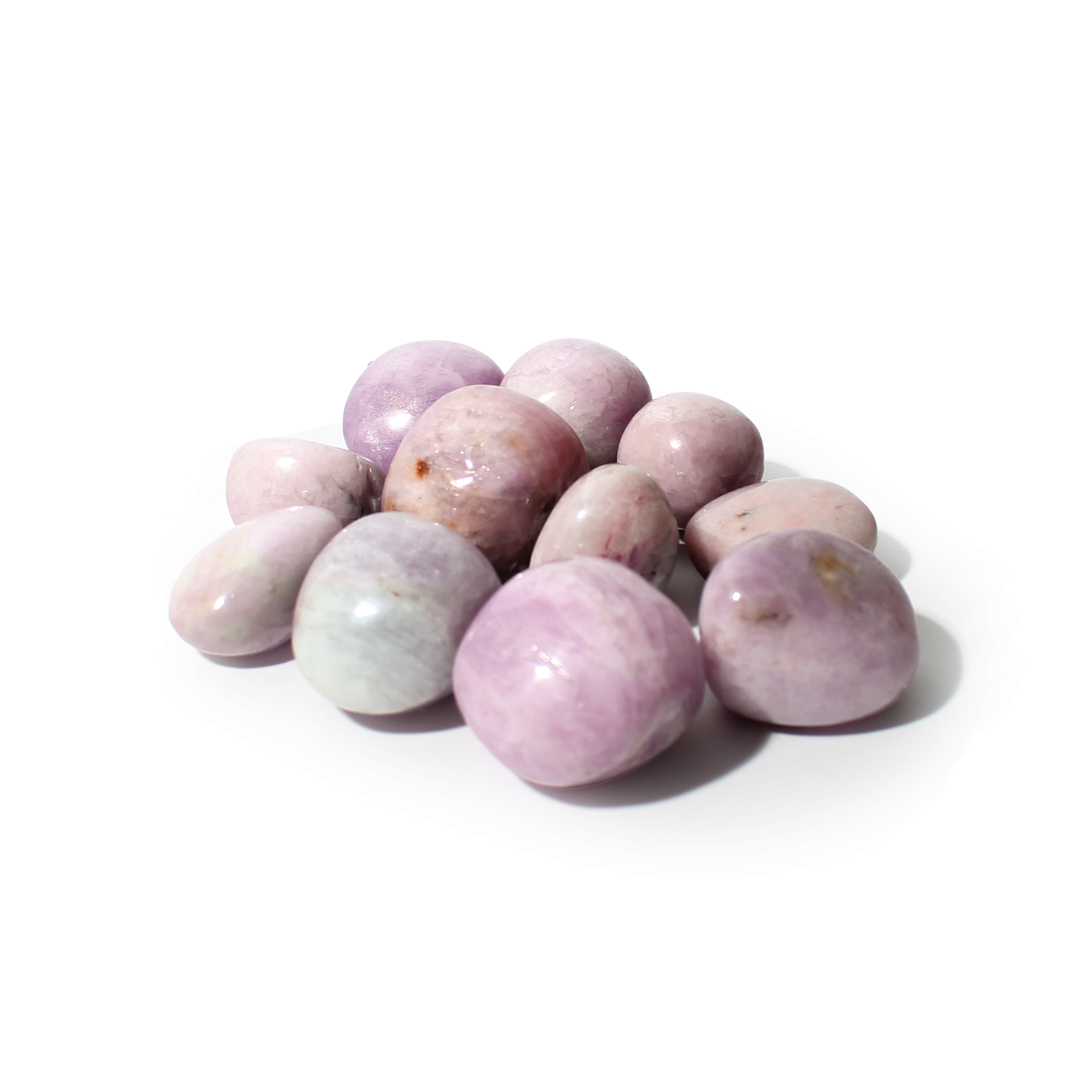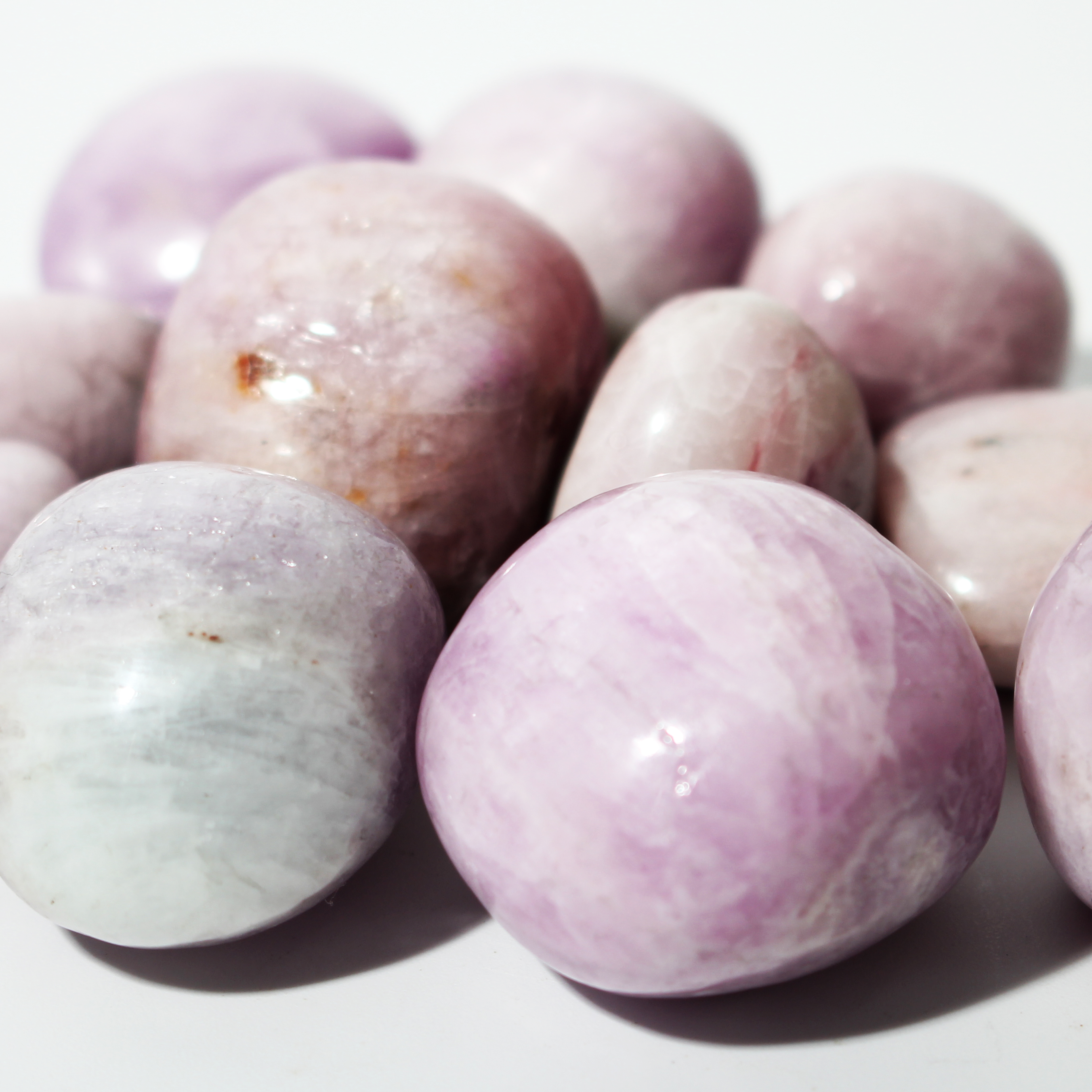 These Kunzite Tumbled Stones feature soft pastel pink to lilac hues with a gentle translucence, polished to a smooth finish perfect for carrying, meditation, or display.