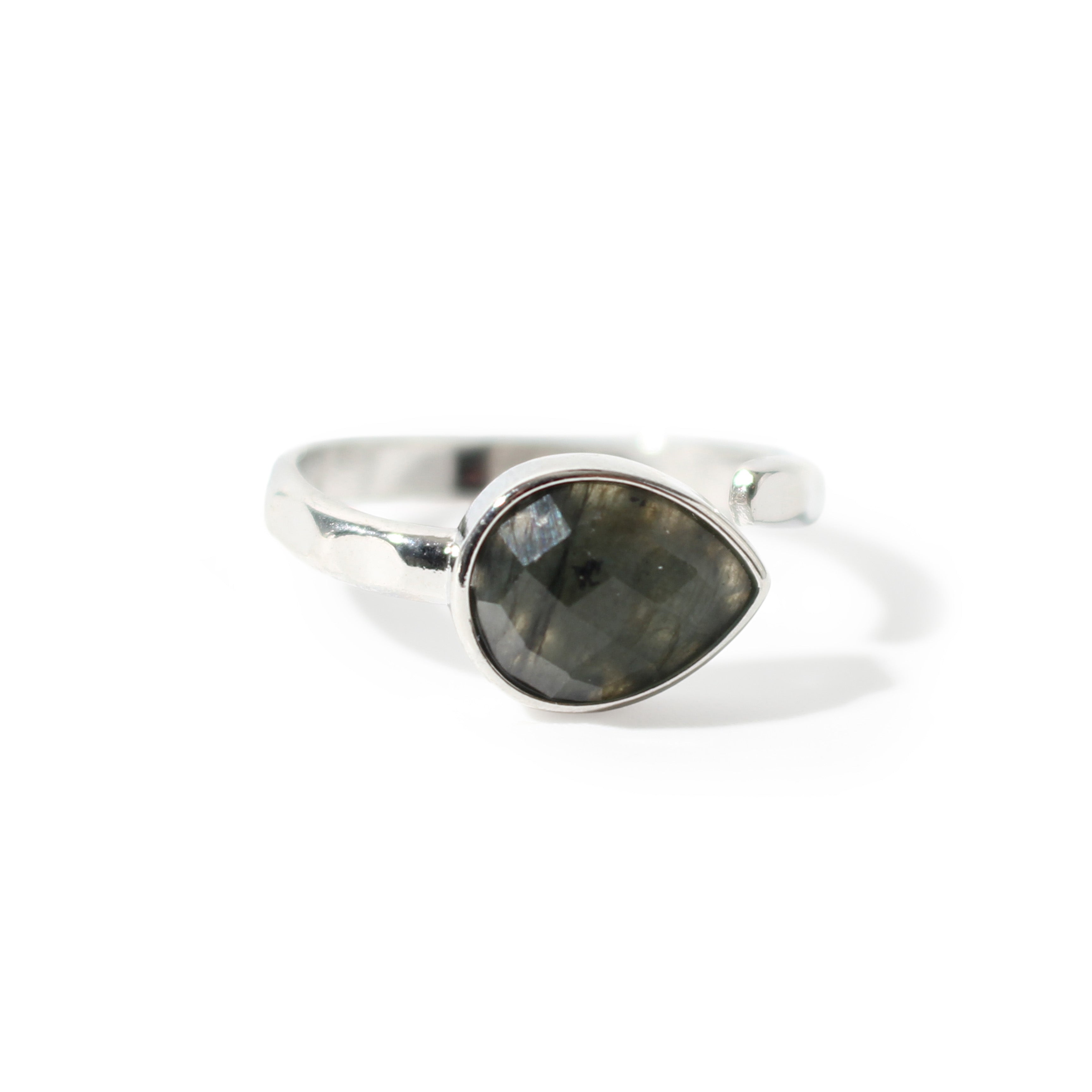 This Labradorite Faceted Drop Ring showcases a luminous teardrop-shaped stone with shifting flashes of blue and gold, set on an adjustable band for a versatile fit. Mysterious and bold, it catches the light and attention with every movement.