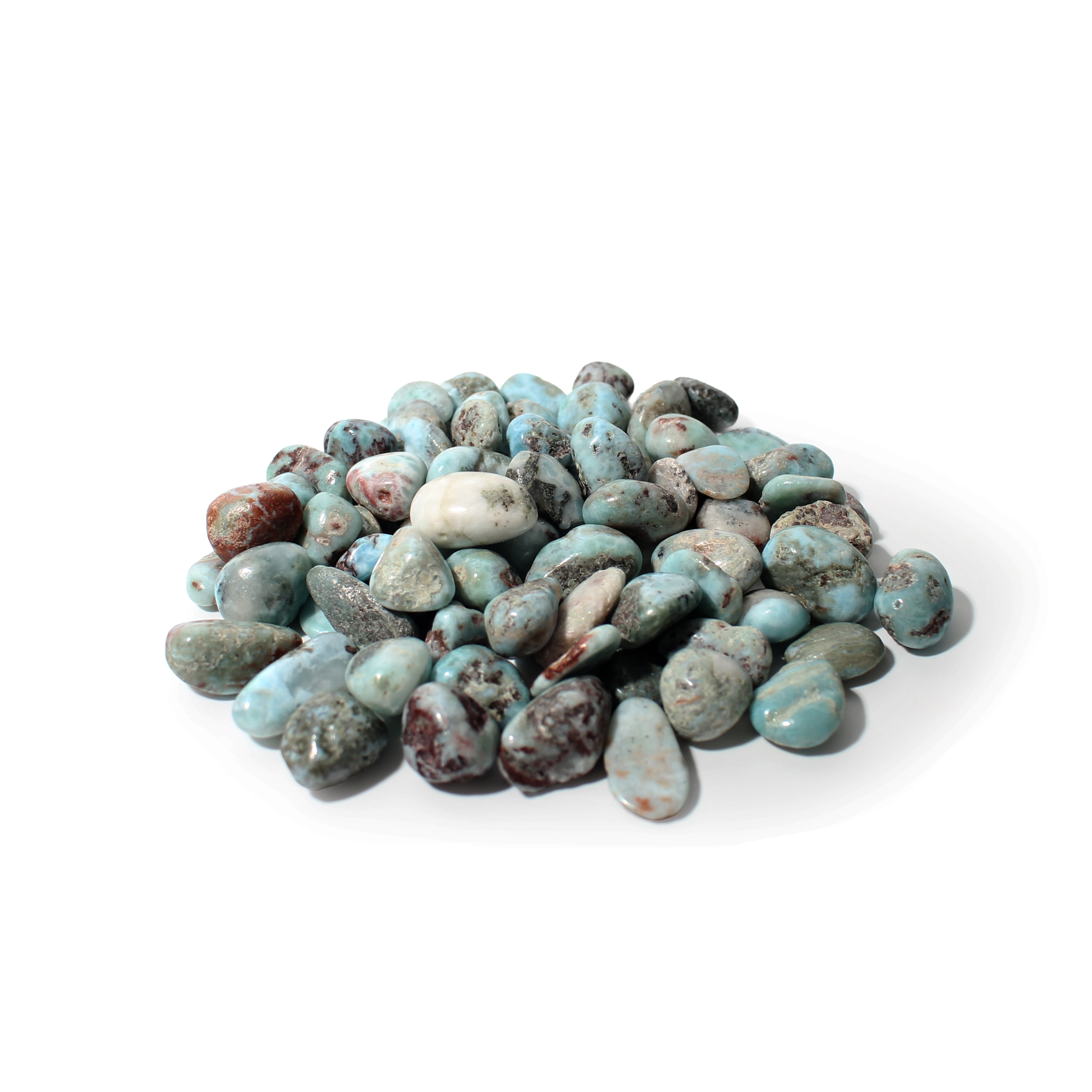 These Larimar Tumbled Stones display serene ocean-blue hues with white marbling, polished smooth to evoke the calm of tropical waters. Perfect for carrying, meditation, or display.