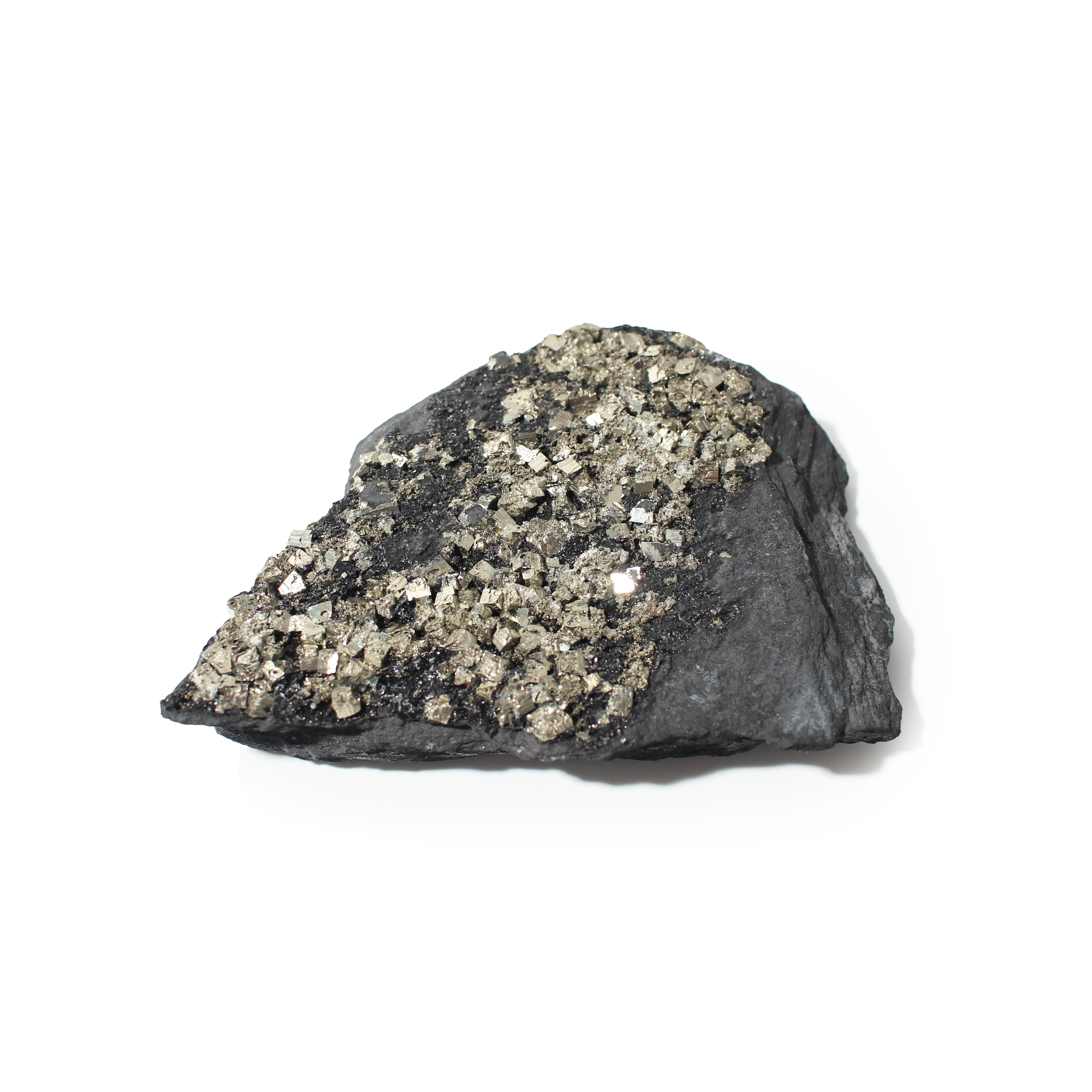 Pyrite on Basalt Specimen #2 features dazzling golden pyrite crystals naturally embedded in dark, volcanic basalt. Measuring up to 2 1/2", this striking contrast of sparkle and stone makes it a standout for collectors and grounding energy work.