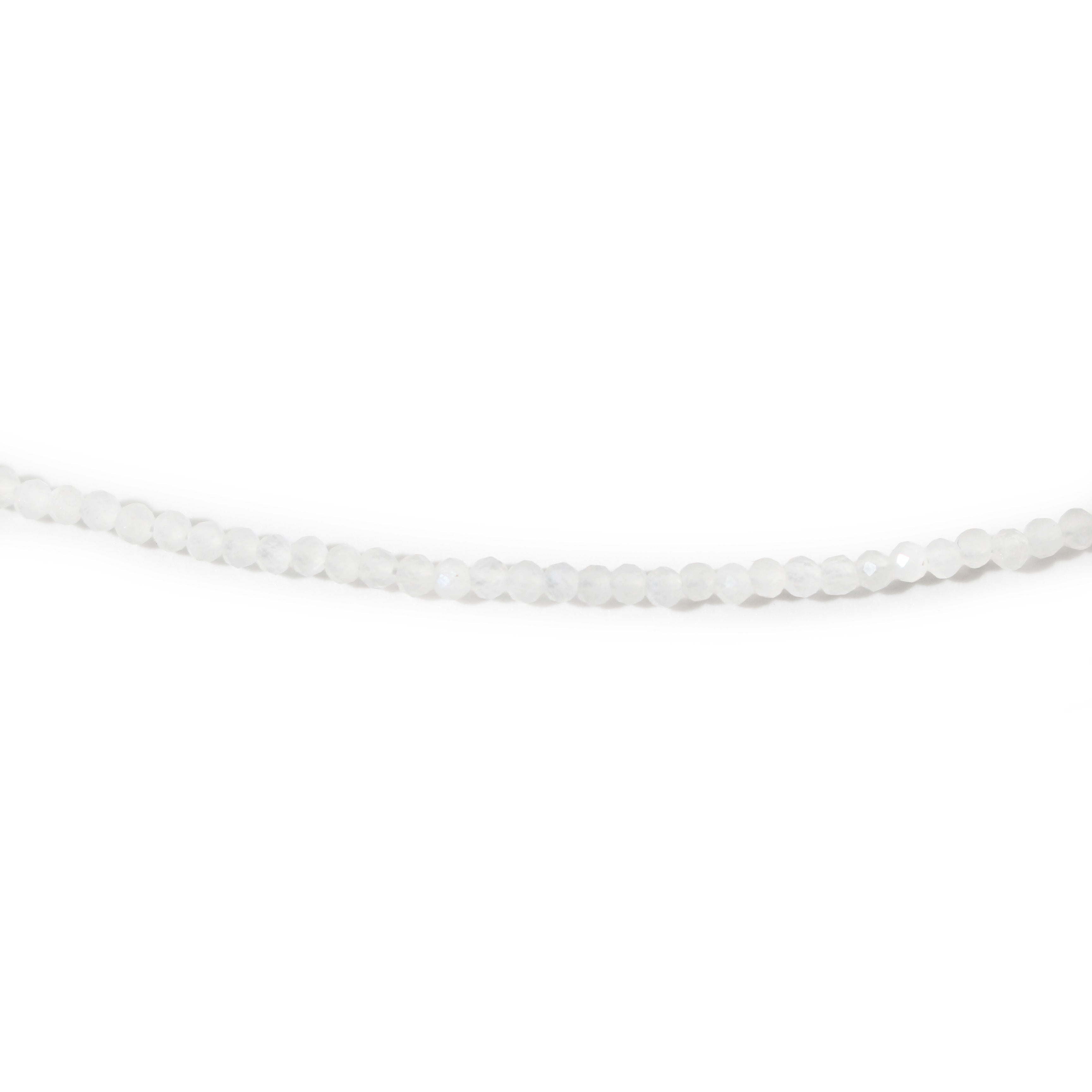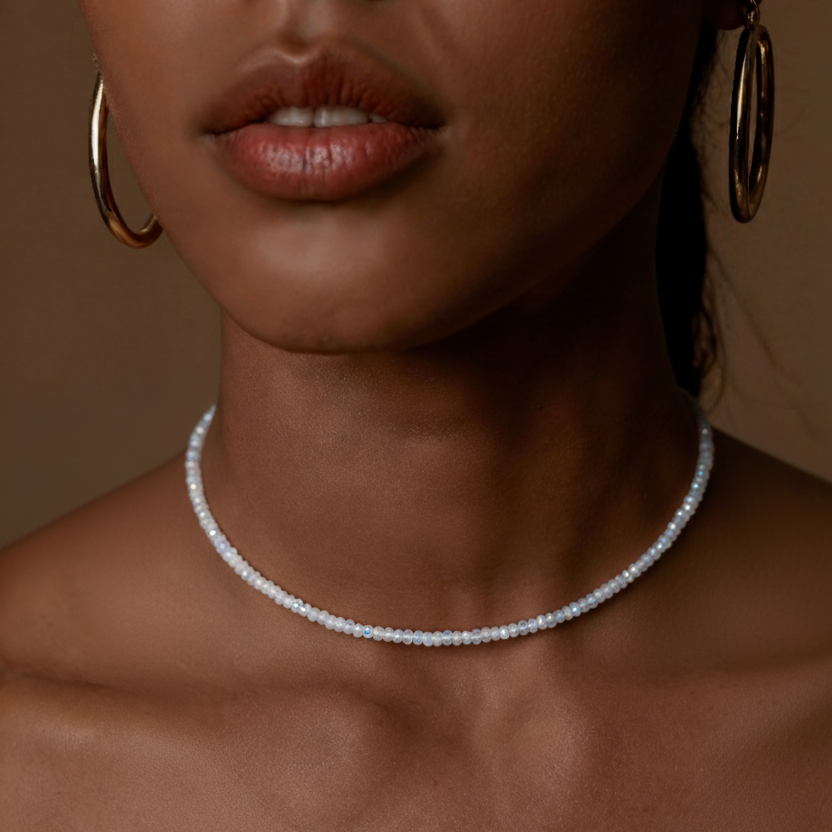 This Rainbow Moonstone Bead Necklace features dainty 2–3mm beads with soft flashes of blue and opal tones. Elegant and enchanting, it carries a luminous, feminine energy.
