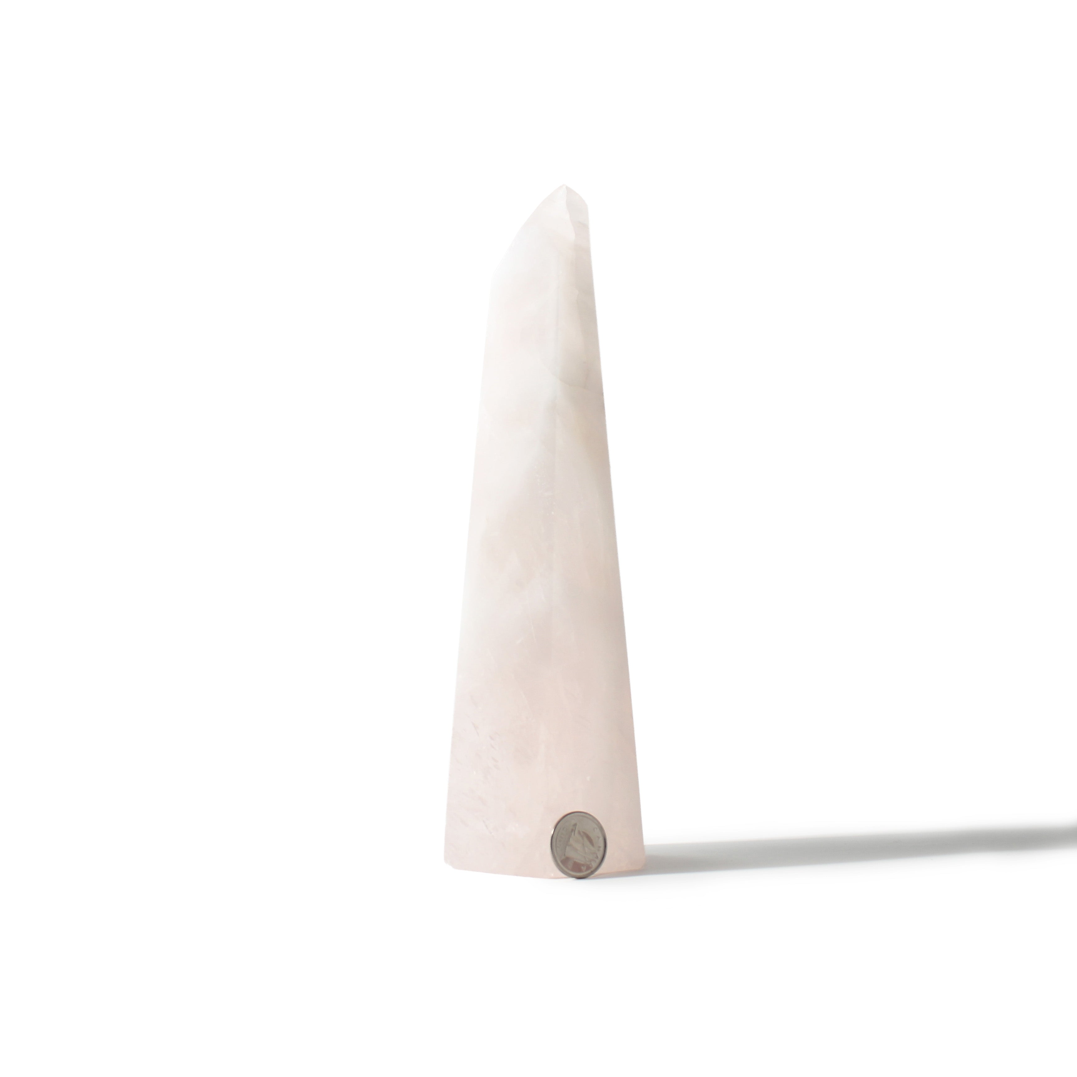 This Rose Quartz Generator stands 8" tall, showcasing soft blush-pink tones with gentle translucency, polished into a smooth, elegant point that radiates calming, heart-centered energy. Each piece highlights Rose Quartz's natural beauty and soothing presence.