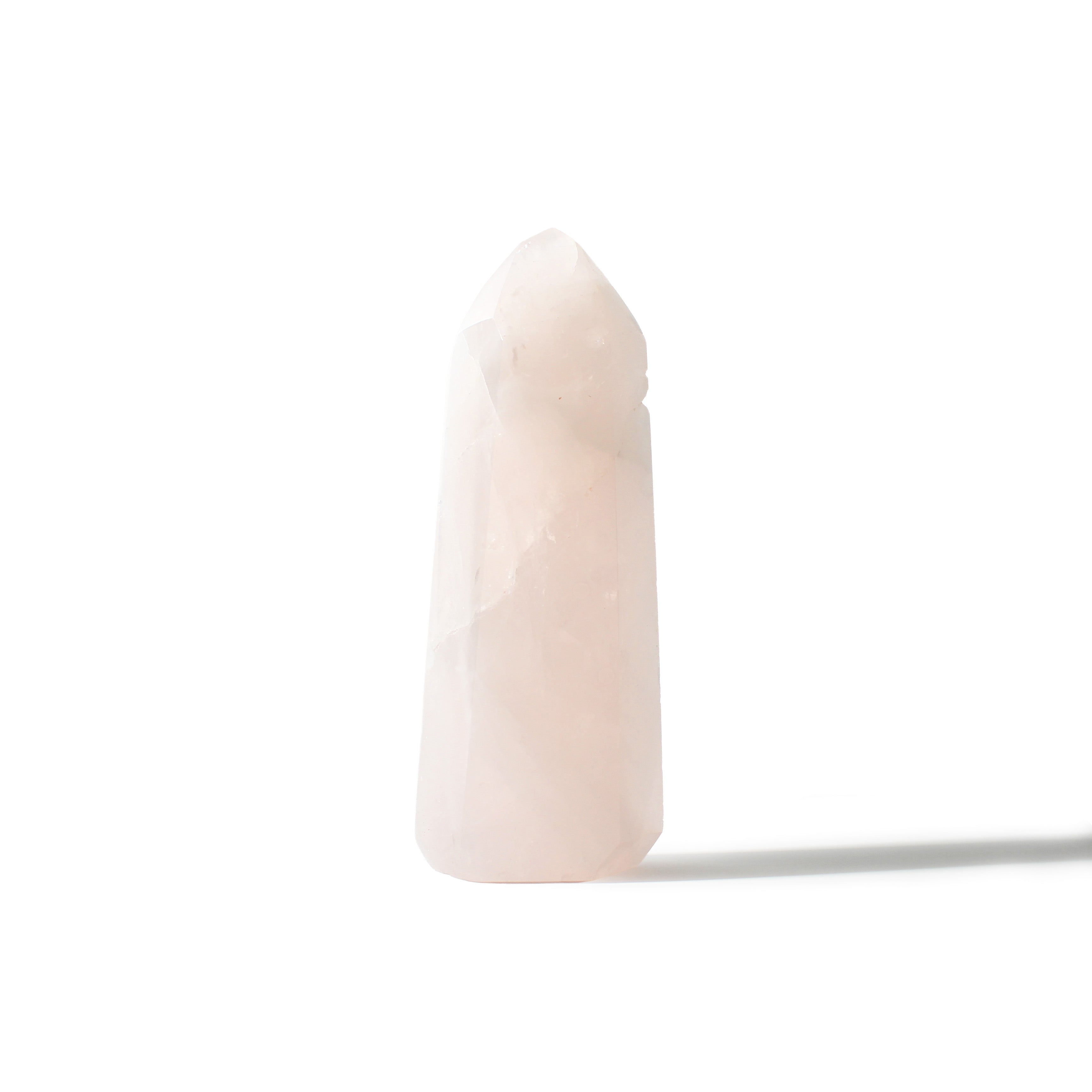 This Rose Quartz Generator stands 6" tall, showcasing soft blush-pink tones with gentle translucency, polished into a smooth, elegant point that radiates calming, heart-centered energy. Each piece highlights Rose Quartz's natural beauty and soothing presence.