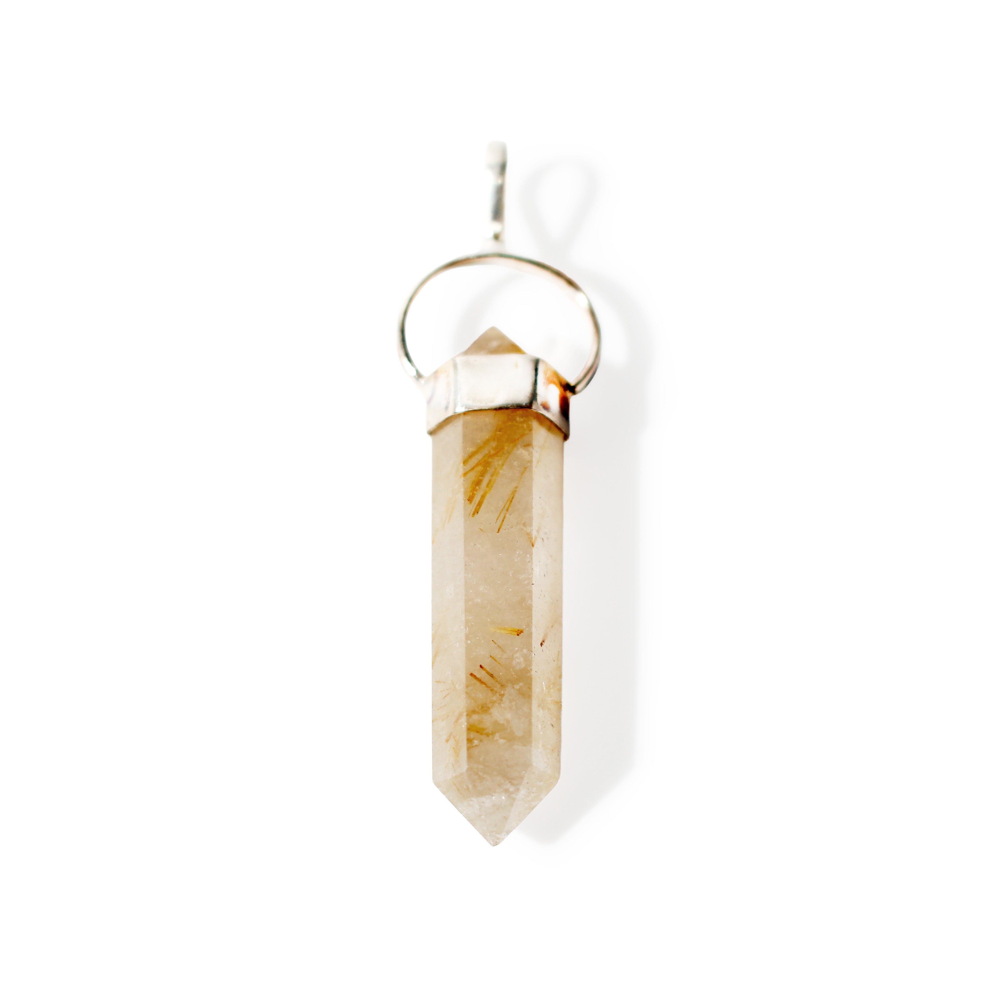 This Rutilated Quartz Double Terminated Pendant features clear to smoky quartz laced with fine golden or coppery rutile strands, carved into a faceted point for amplified, balanced energy flow. Unique, radiant, and deeply activating.