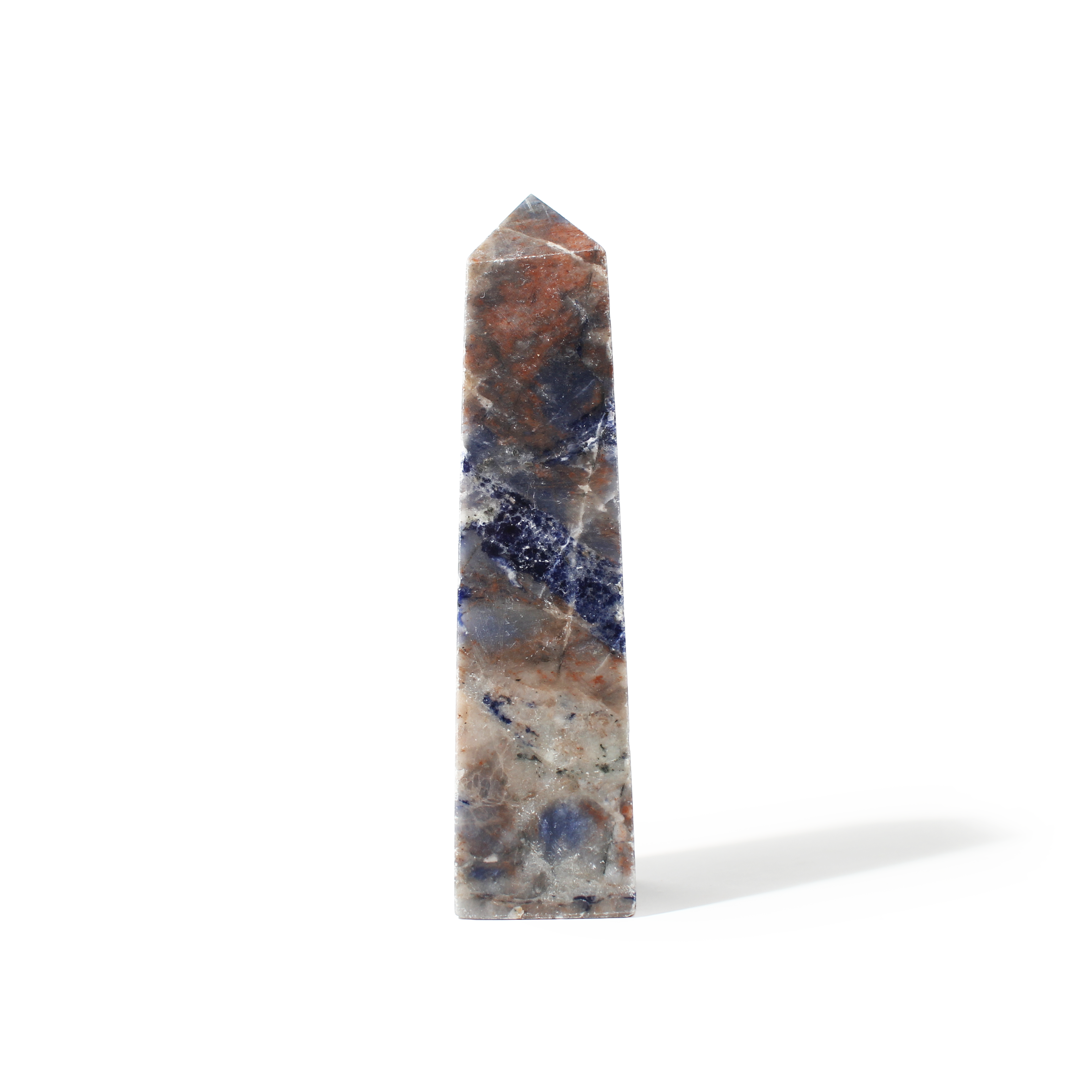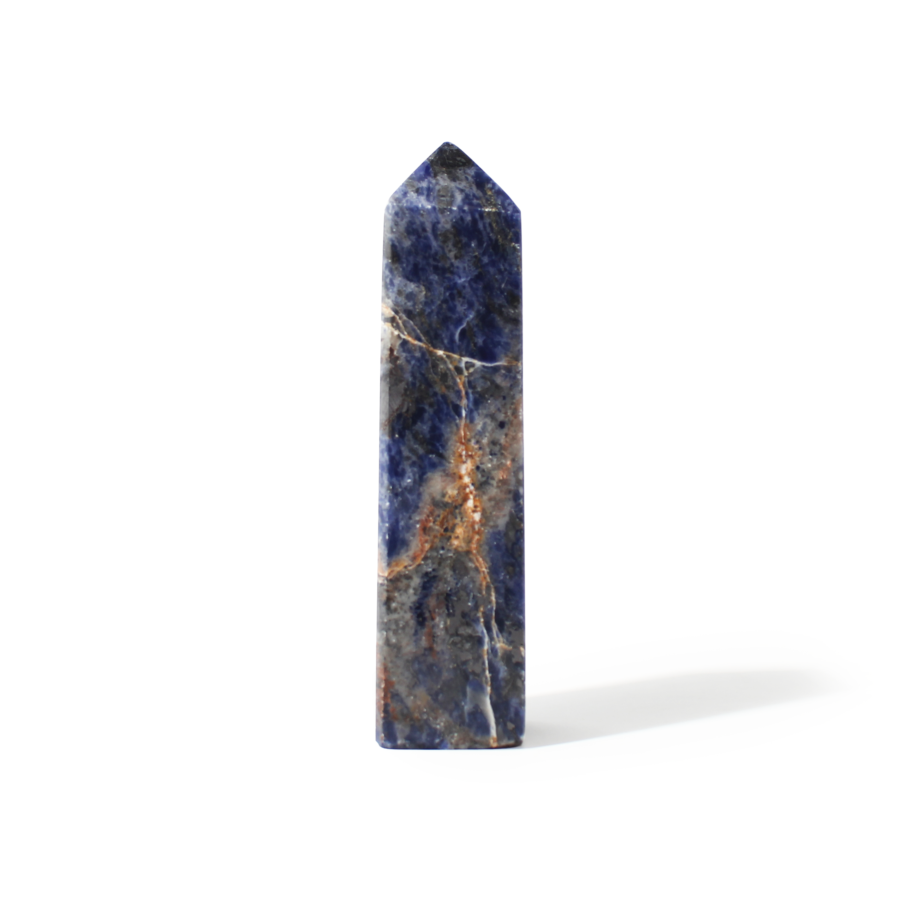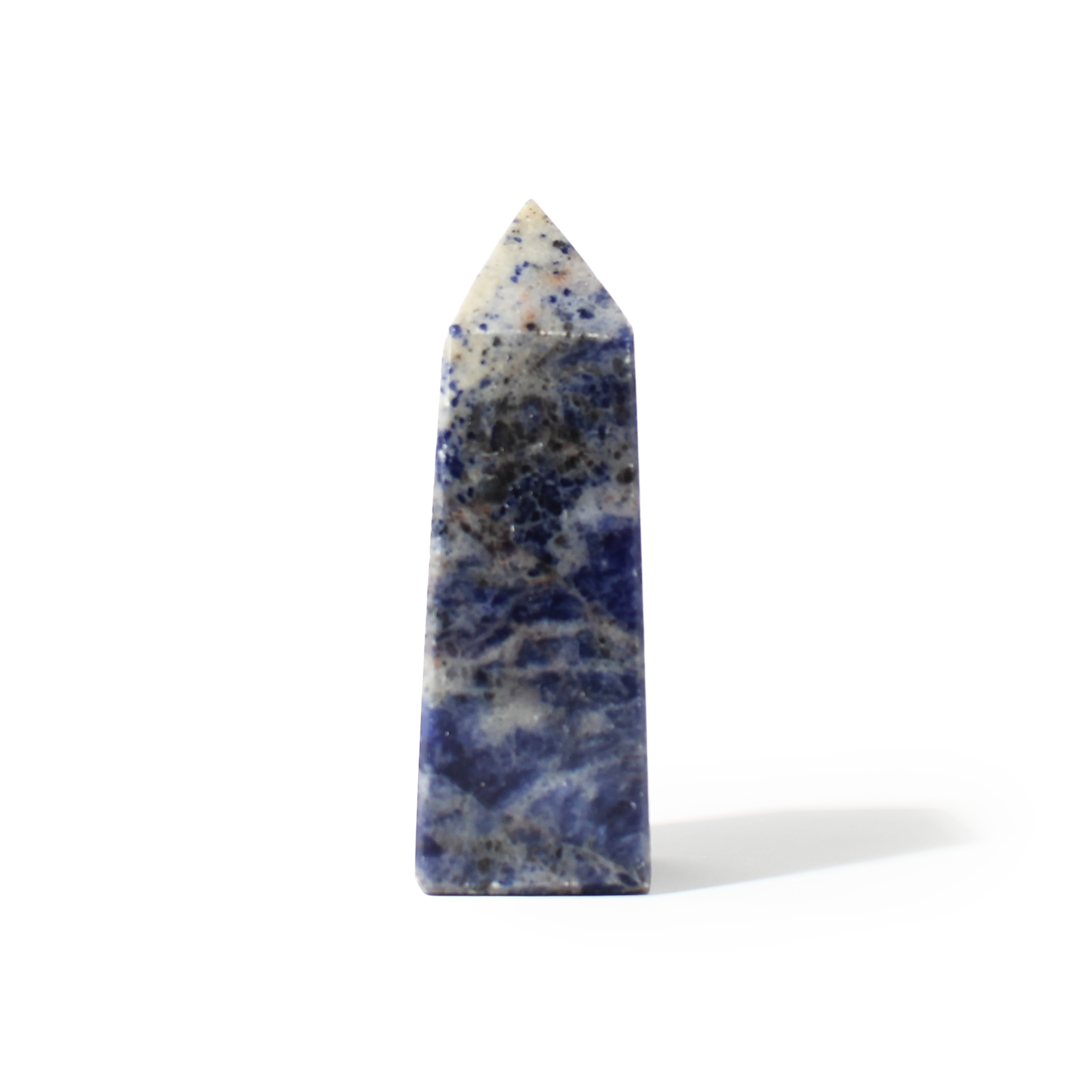 This Sodalite Tower features deep blue tones accented with white and grey marbling, polished into a sleek, pointed form. Bold yet calming, it's a powerful tool for mental clarity, communication, and spiritual insight.