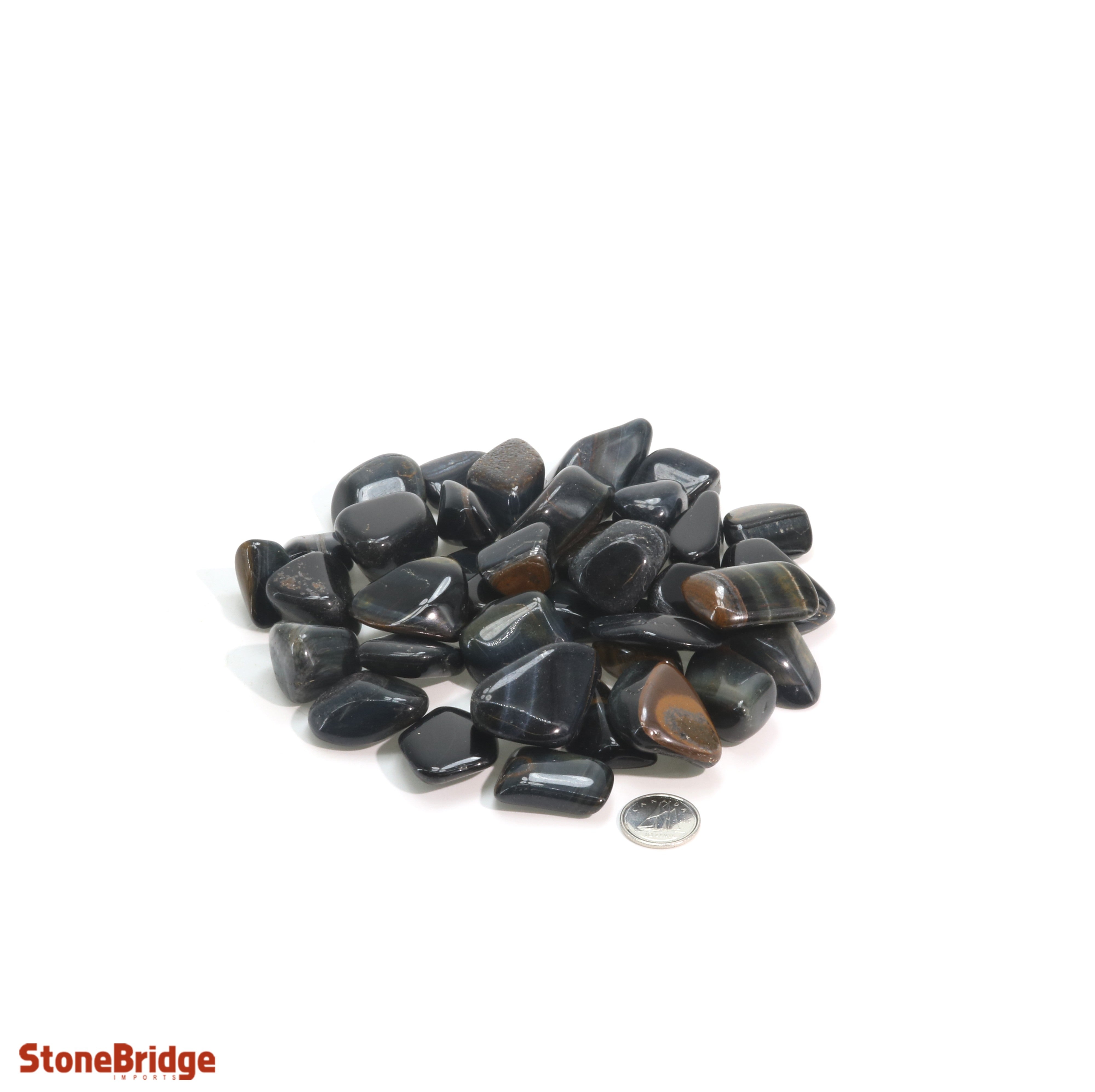 Tumbled Blue Tiger Eye has mid-dark blue colours bearing dark-grey bands.