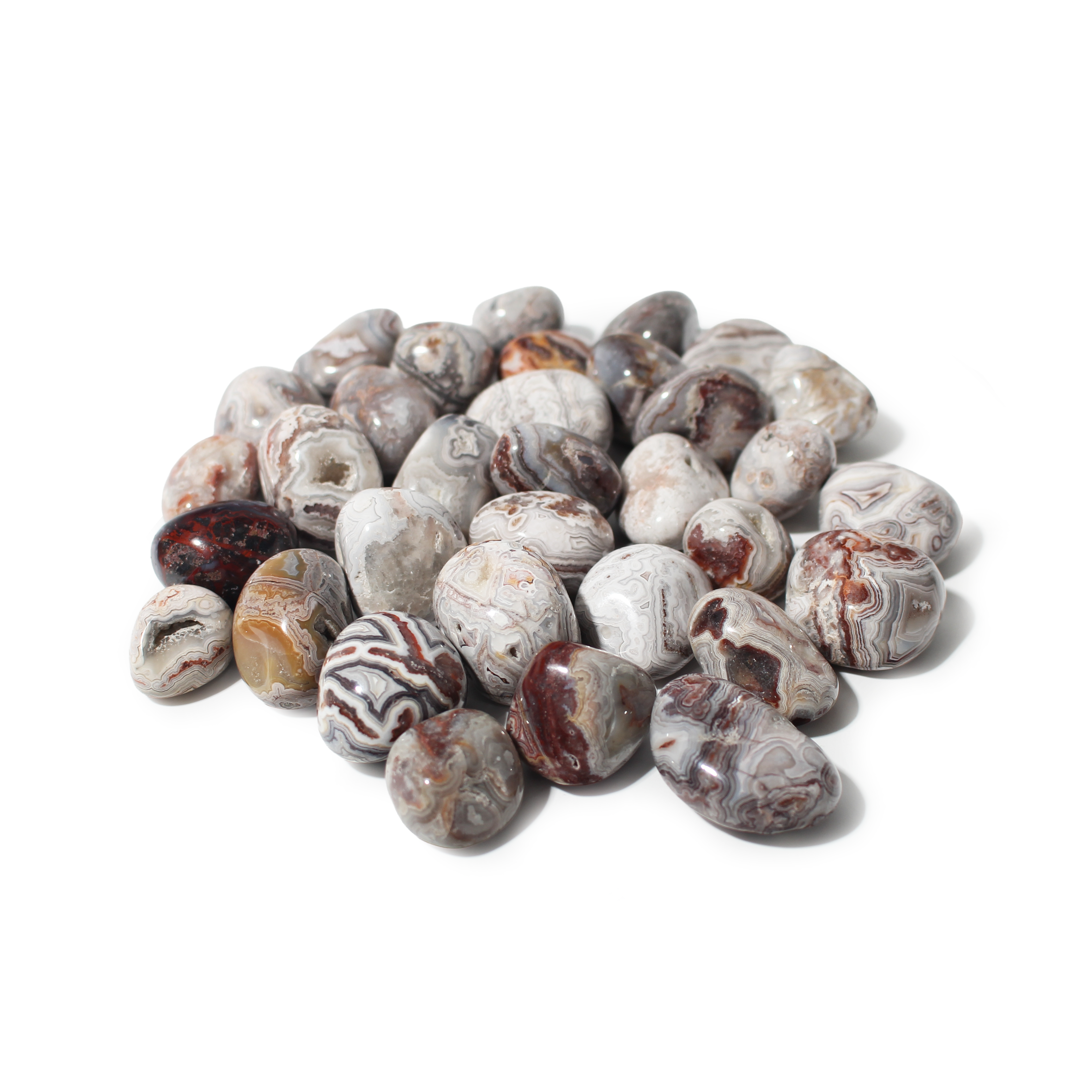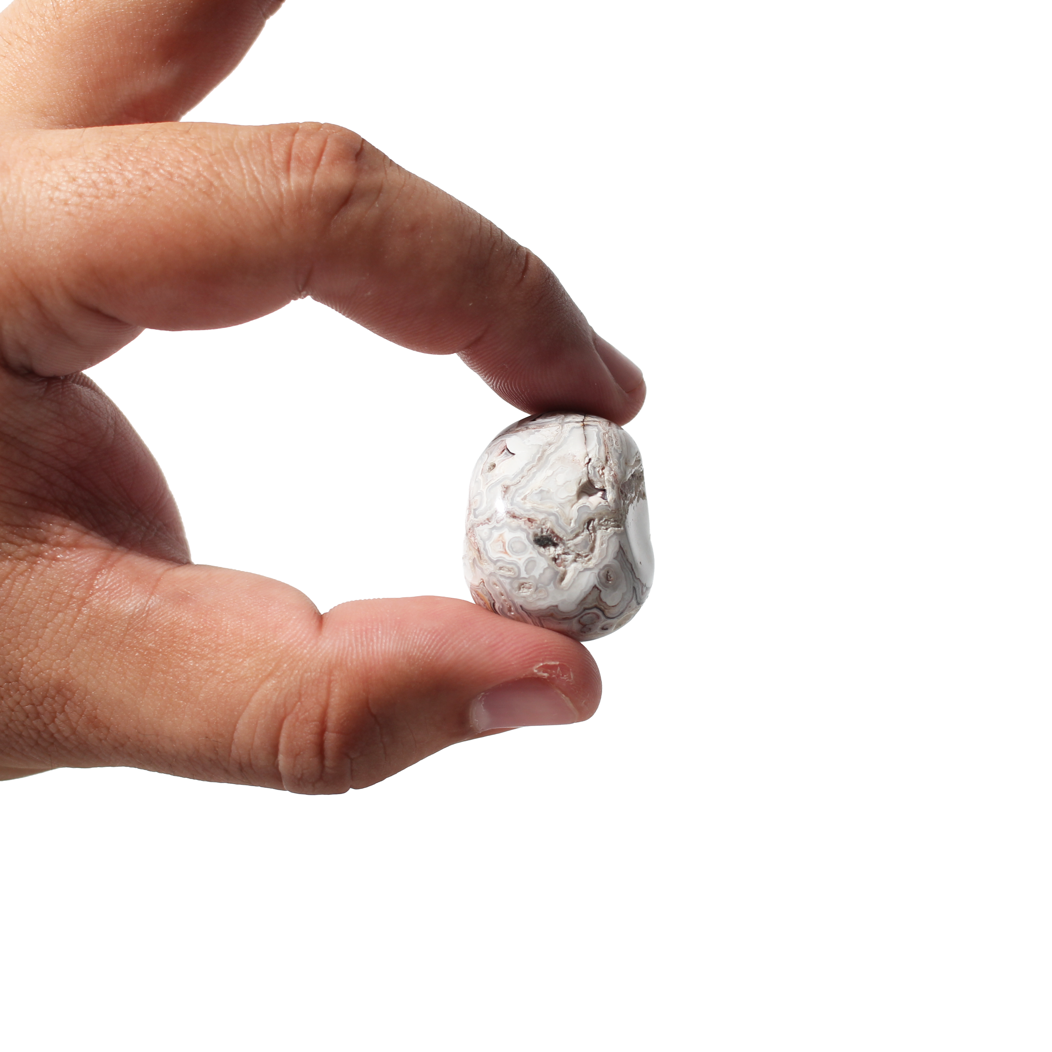 These White Crazy Lace Agate Tumbled Stones feature intricate swirling patterns in soft white and cream tones, polished smooth to highlight their natural lace-like designs. Perfect for carrying, meditation, or display.